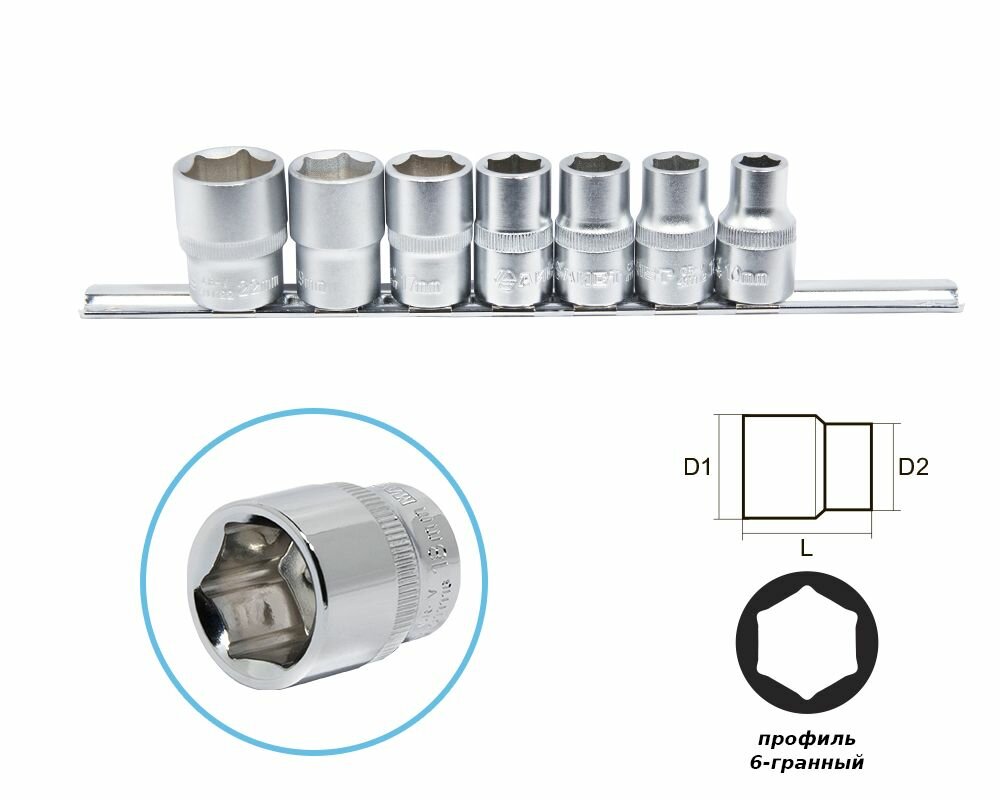 Набор сменных торцевых головок 1/2" дюйма 6-гранных 10-22 мм 7 предметов на металлической планке используется для взаимодействия с резьбовыми соединениями шестигранного профиля. Набор шестигранных головок 1/2" включает ряд головок размером от 10 мм до 22 мм. Для использования набора больших сменных головок 1/2" потребуется наличие воротка или трещотки с присоединительным квадратом 1/2" дюйма. Набор головок под большую трещетку или вороток.Материалы и технологический процесс изготовления:- сталь: хромованадиевая Cr-V 50BV30;- обработка: полирование, закалка ТВЧ;- покрытие: трехслойное хромоникелевое матовое;- твердость: 42-46 HRC.Конфигурация:- 6-гр. динамический профиль;- посадочный квадрат 1/2" (12.7мм) с динамическим профилем.Комплектация:1/2" Головка 6-гр: 10, 12, 13, 14, 17, 19, 22 мм - 7 шт.Прочее:- на металлической планке держателе (рельсе).