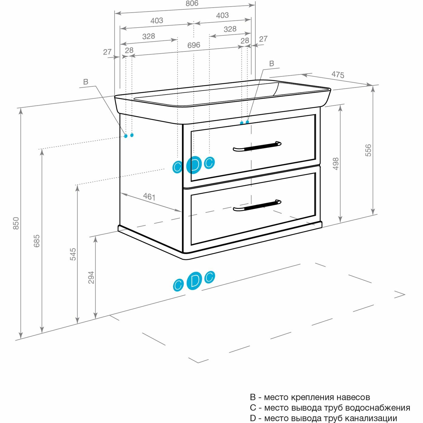 - Размеры корпуса тумбы (ШхВхГ): 806х498х461 мм.