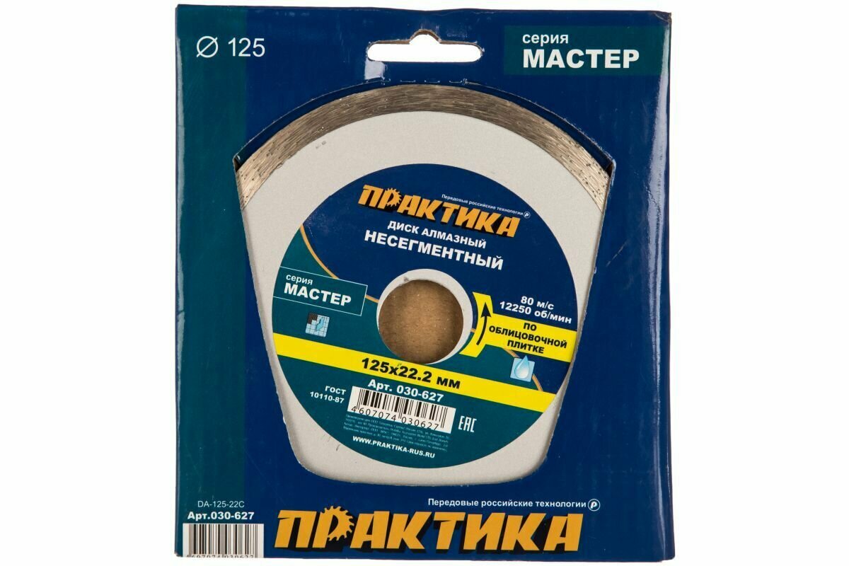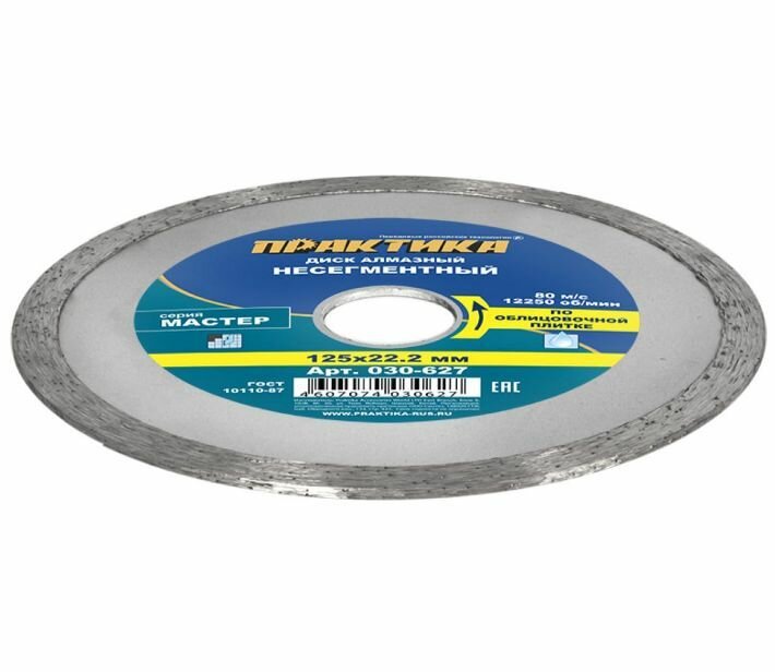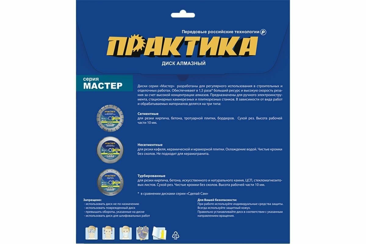 Садовый инструмент Практика 030-627 ПРАКТИКА 030-627 - предназначен для резания кафельной плитки, мраморной облицовочной плитки. Работа с регулярным охлаждением водой. Для ручного инструмента и небольших станков. Обеспечивает чистый рез без сколов. Высокая скорость реза и ресурс. Во время пиления для охлаждения диска, вынимайте диск из пропила каждые 30 секунд.