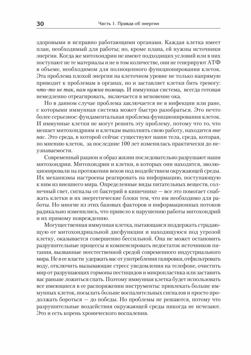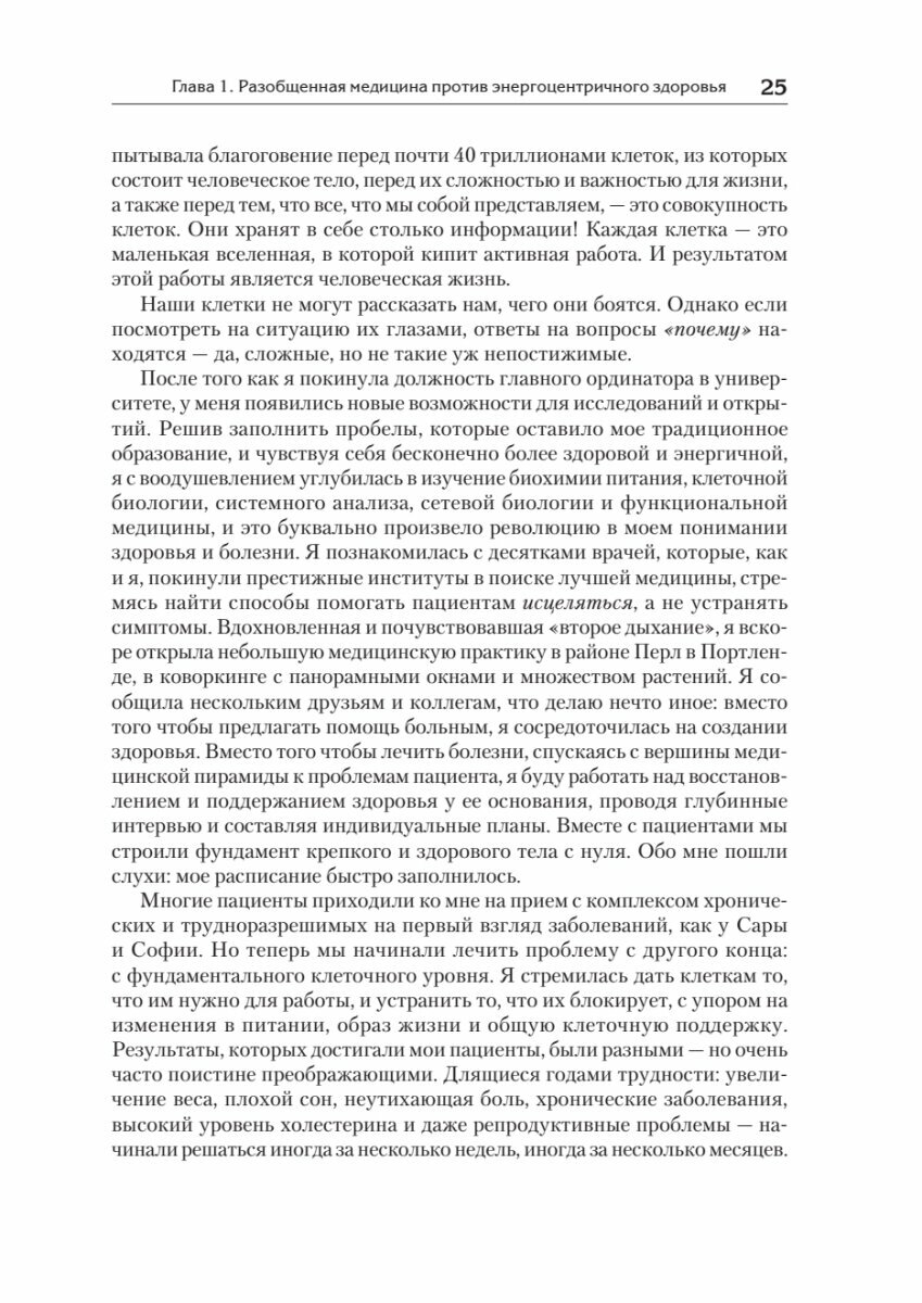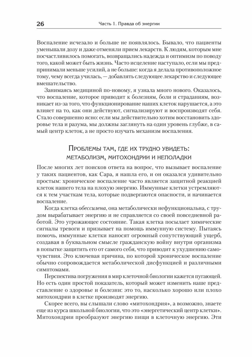 Наша способность предотвращать и обращать вспять эти состояния - и чувствовать себя потрясающе сегодня - находится под нашим контролем и это проще, чем мы думаем. Ключом к этому является функция обмена веществ - самый важный и наименее изученный фактор нашего общего состояния здоровья. Как объясняет доктор Кейси Минс в своей новаторской книге, почти каждая проблема со здоровьем, с которой мы сталкиваемся, может быть объяснена тем, насколько хорошо клетки нашего организма вырабатывают и используют энергию. Чтобы жить без неприятных симптомов и опасных для жизни заболеваний, нам нужно, чтобы наши клетки были в оптимальном состоянии, чтобы они могли вырабатывать “добрую энергию”, необходимое топливо, влияющее на каждый аспект нашего физического и психического благополучия.