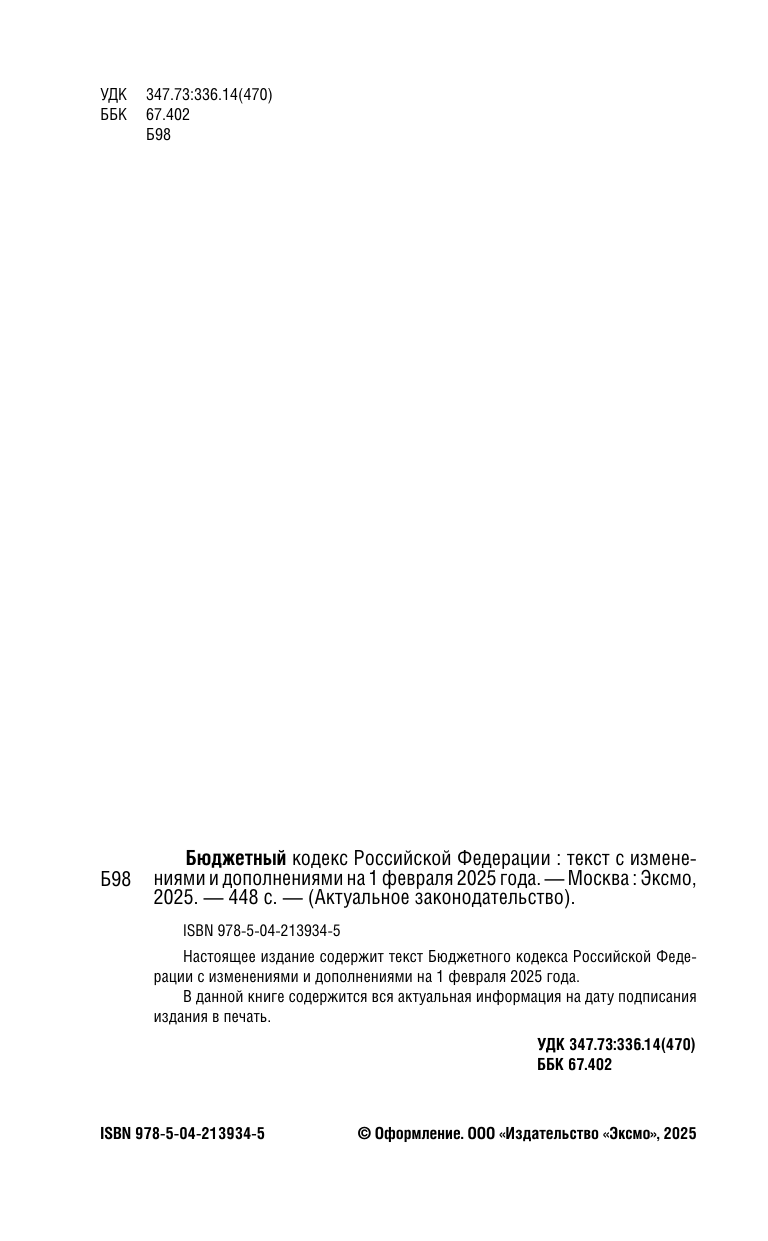 Бюджетный кодекс РФ. В ред. на 01.02.25 / БК РФ; Эксмо, 2025