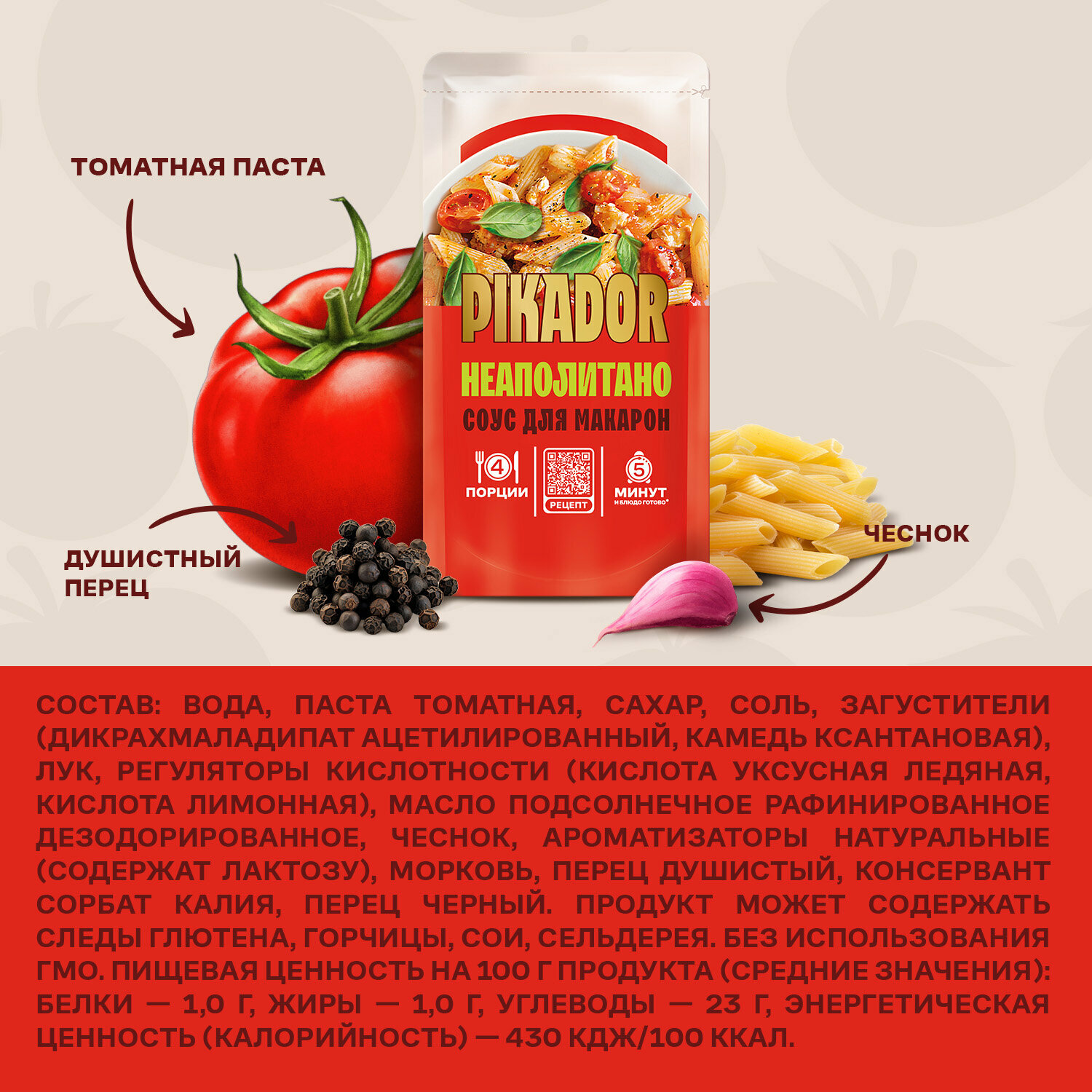 Соус для макарон PIKADOR представлен в удобной упаковке весом 200гУпаковка рассчитана на 4 порции, что позволяет использовать весь продукт за одно приготовление без необходимости хранить оставшийся соус в холодильнике.