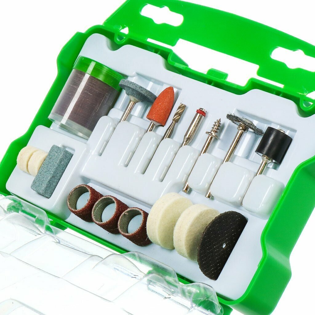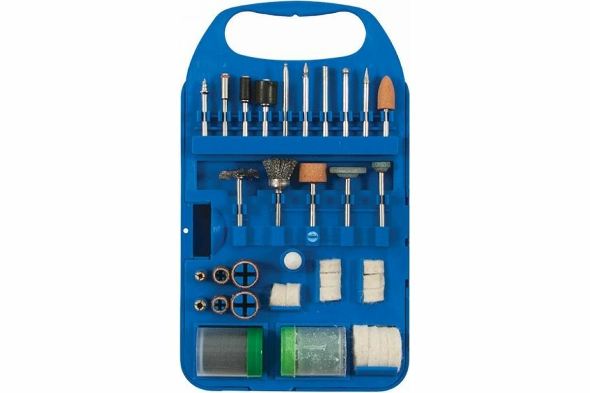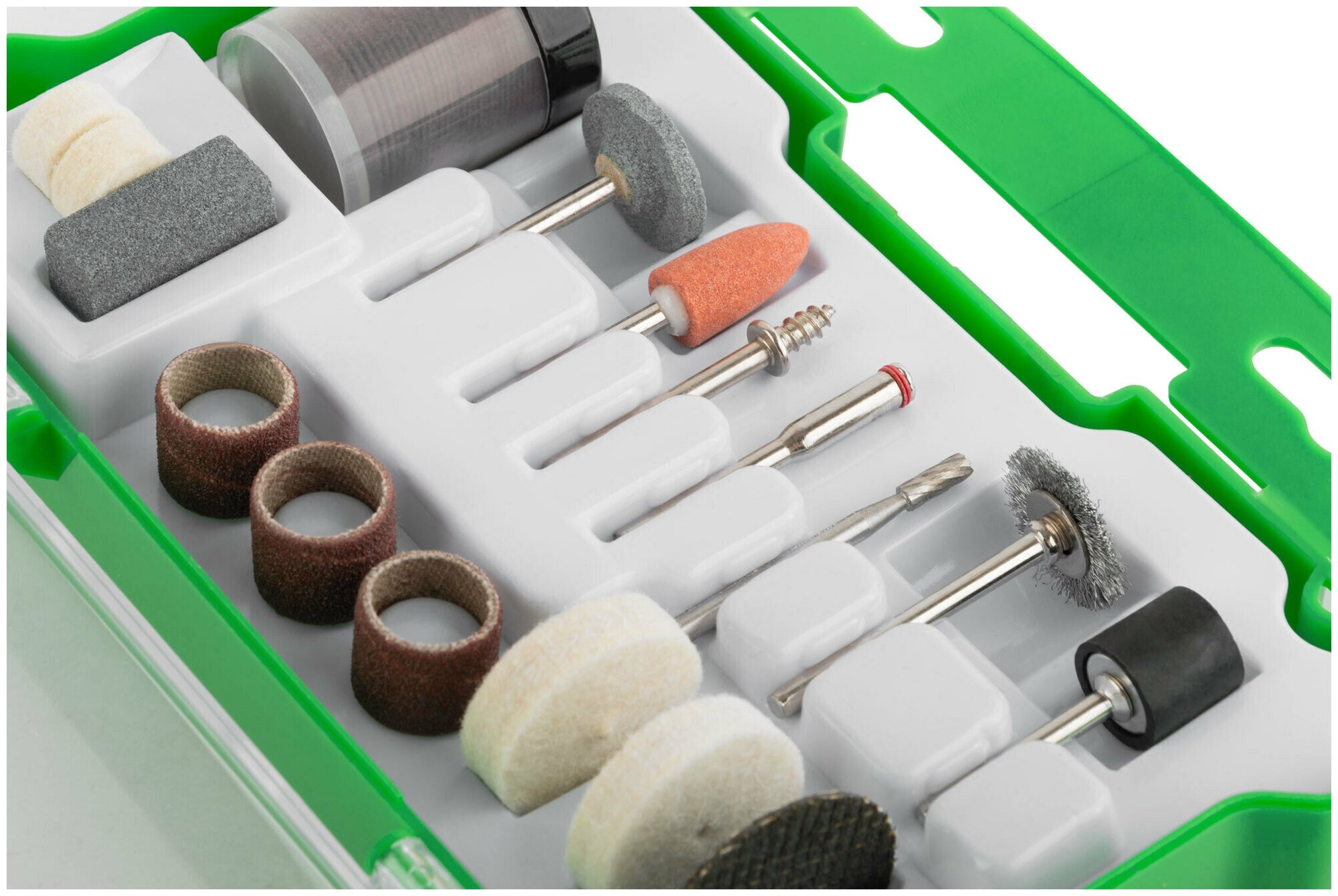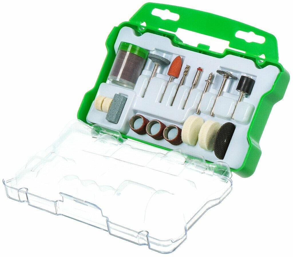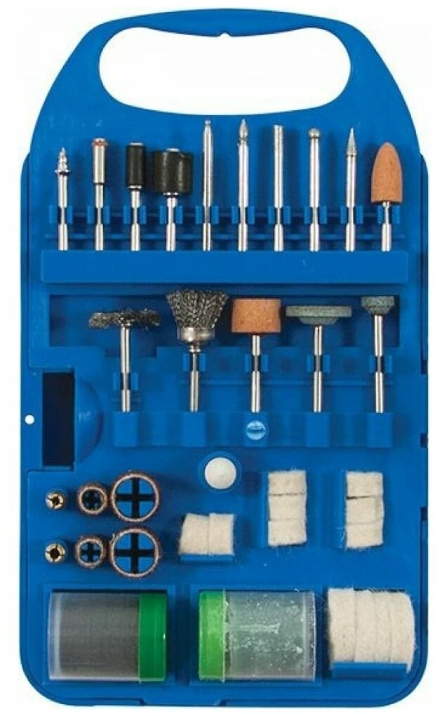 | Комплектация | фетровые насадки; штифты для фетровых насадок и отрезных кругов; держатель для наждачных трубок; наждачные трубки; кордщетка-насадка тип «колесо»; шарошки-мини по металлу; круги отрезные абразивные. |