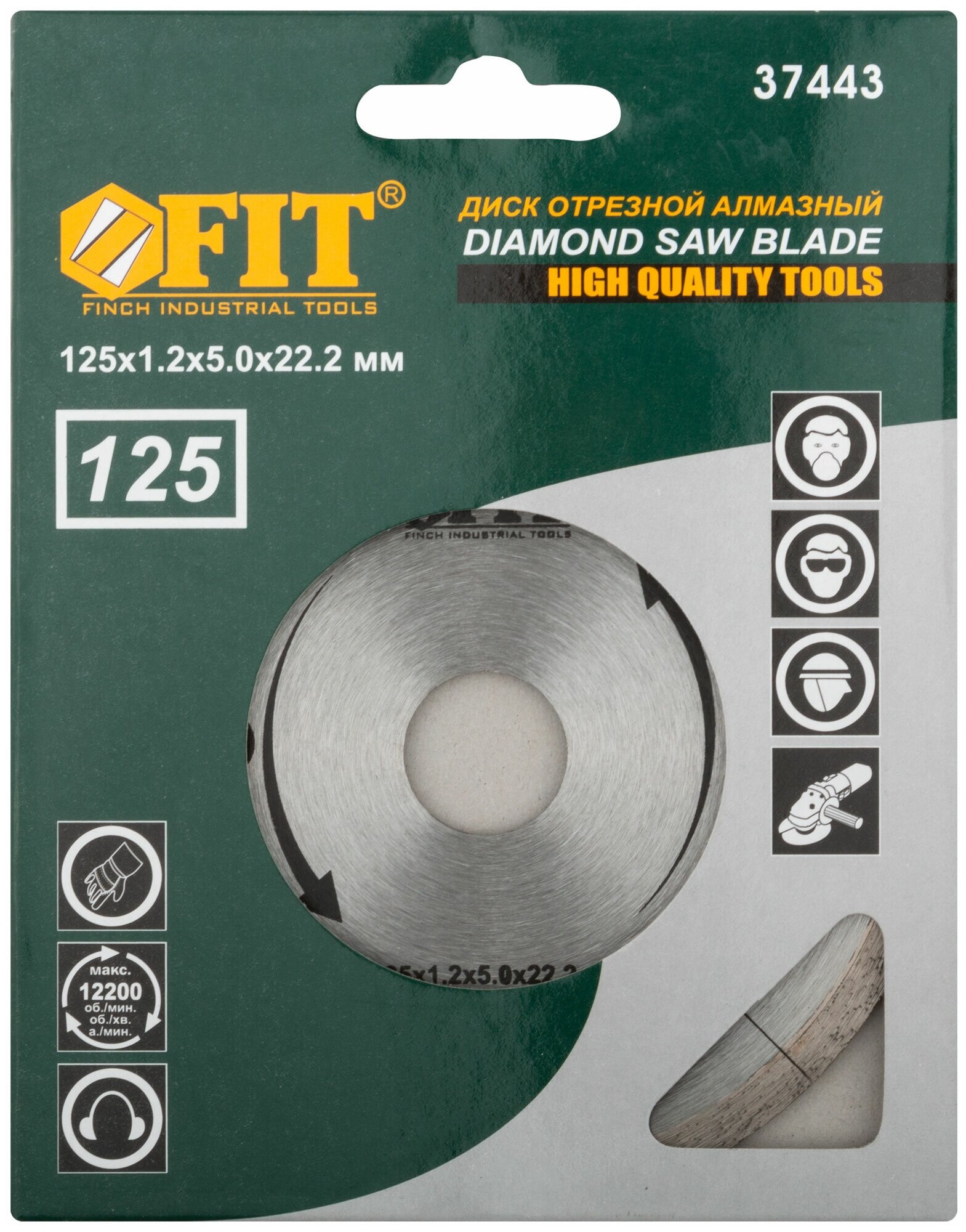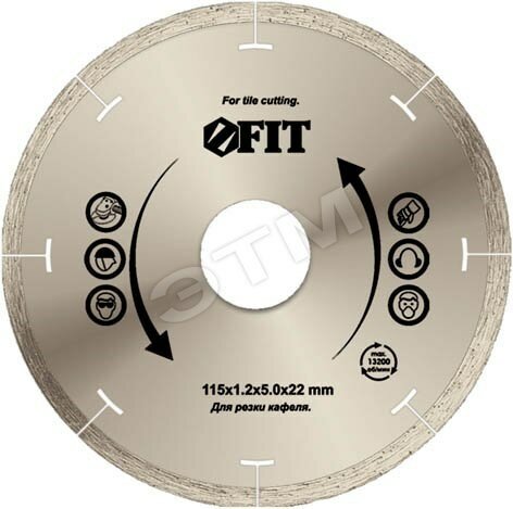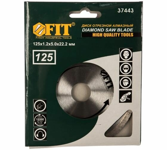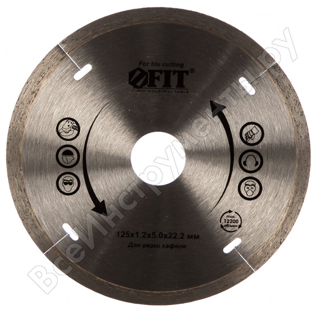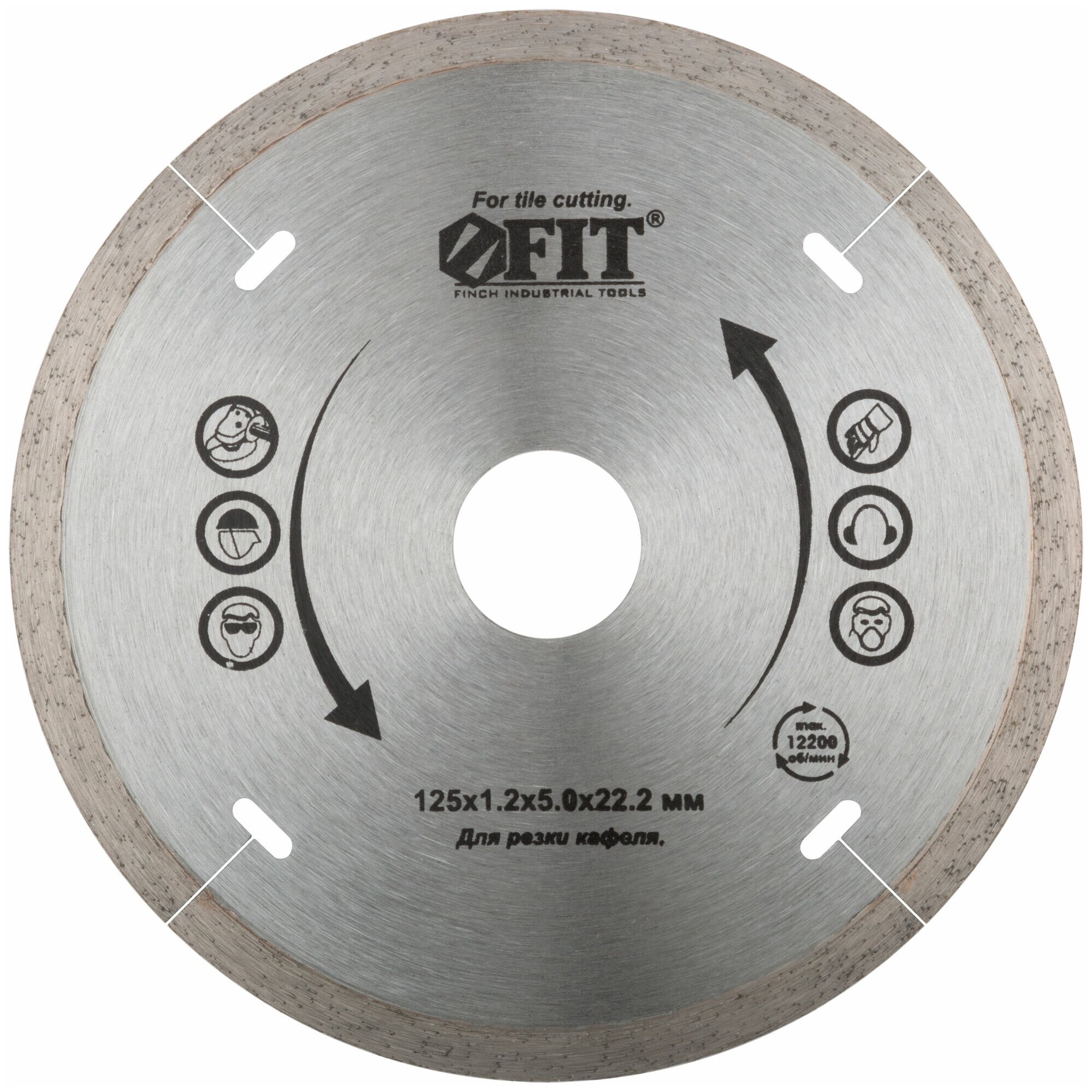 Сплошной отрезной алмазный диск торгового бренда FIT (Канада) обладает наружным размером 125 мм и стандартной величиной посадочного отверстия 22,2 мм. Он применяется для раскроя керамогранита, кафеля и натурального камня. Оснастка устанавливается на электрический плиткорез и позволяет непрерывно обрабатывать большое количество материала при условии использования охлаждающей жидкости. Диск можно ставить на УШМ, но для маленьких распилов с длительностью 10-15 секунд и периодом охлаждения в течение 30 секунд.