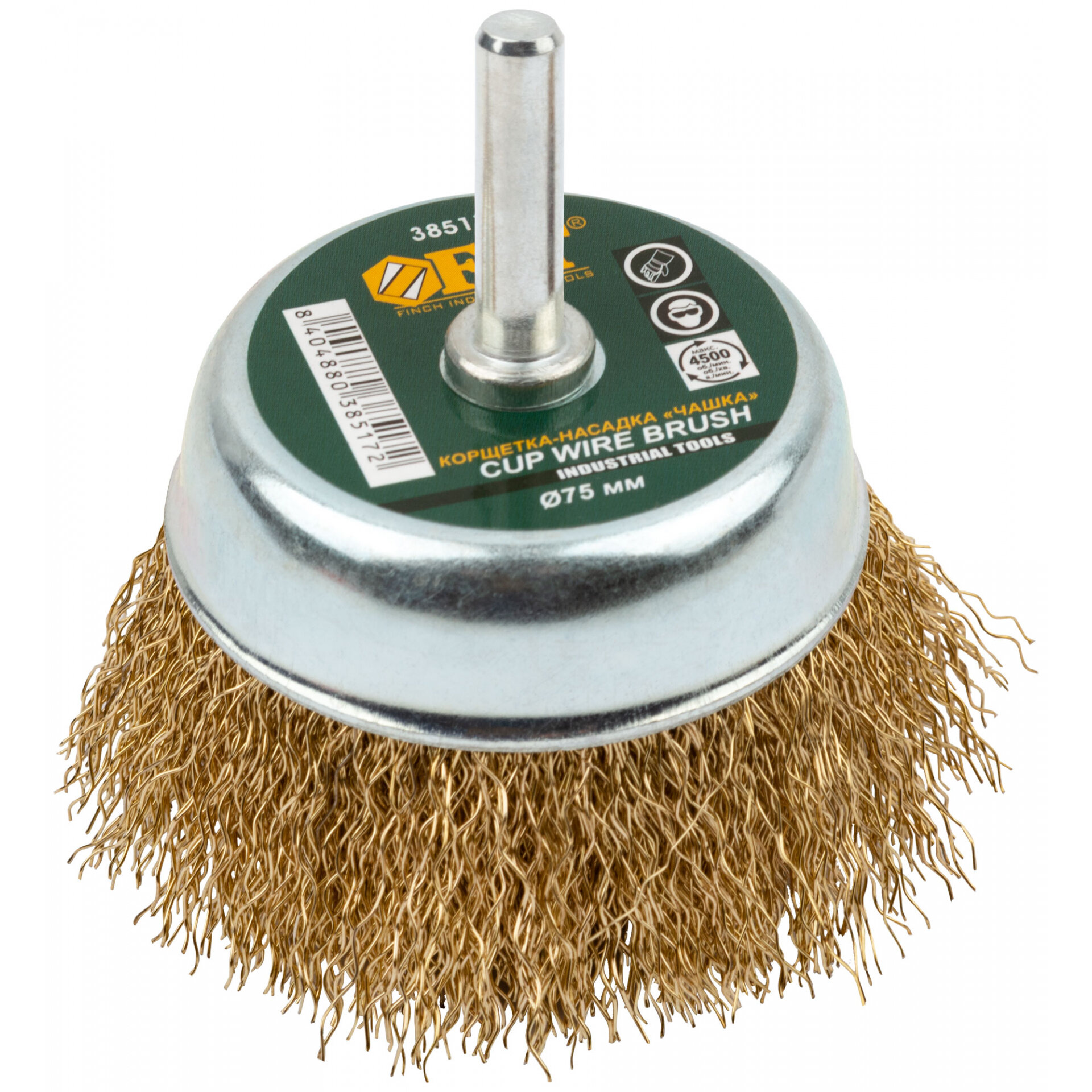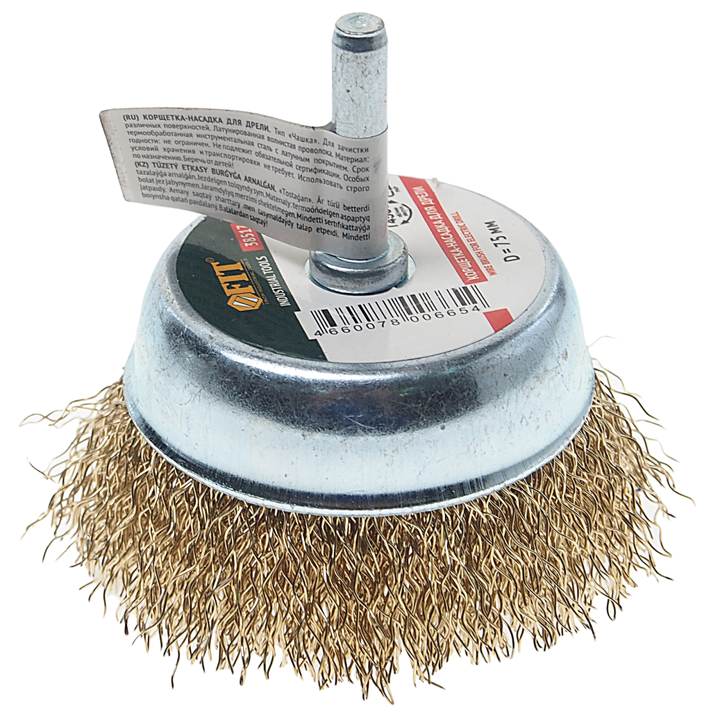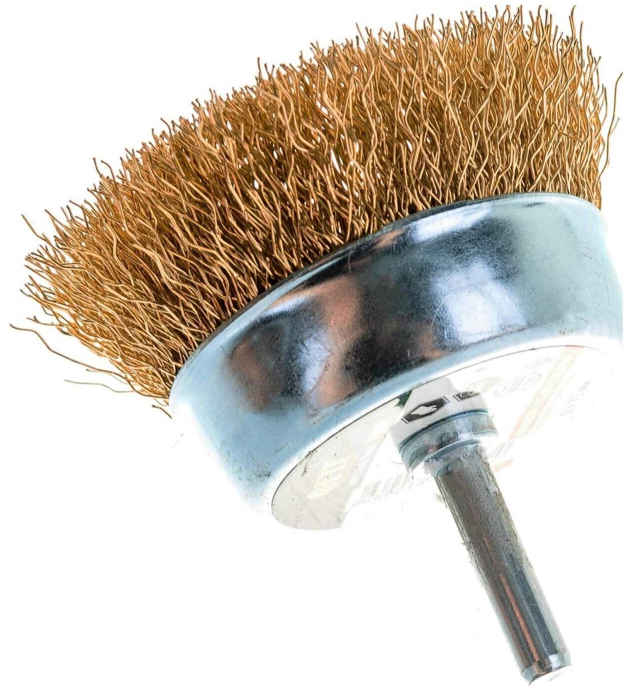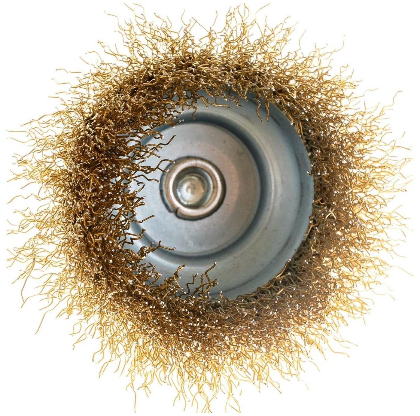 Корщетка-насадка для дрели. Тип «чашка». Материал: стальная, латунированная, волнистая проволока.