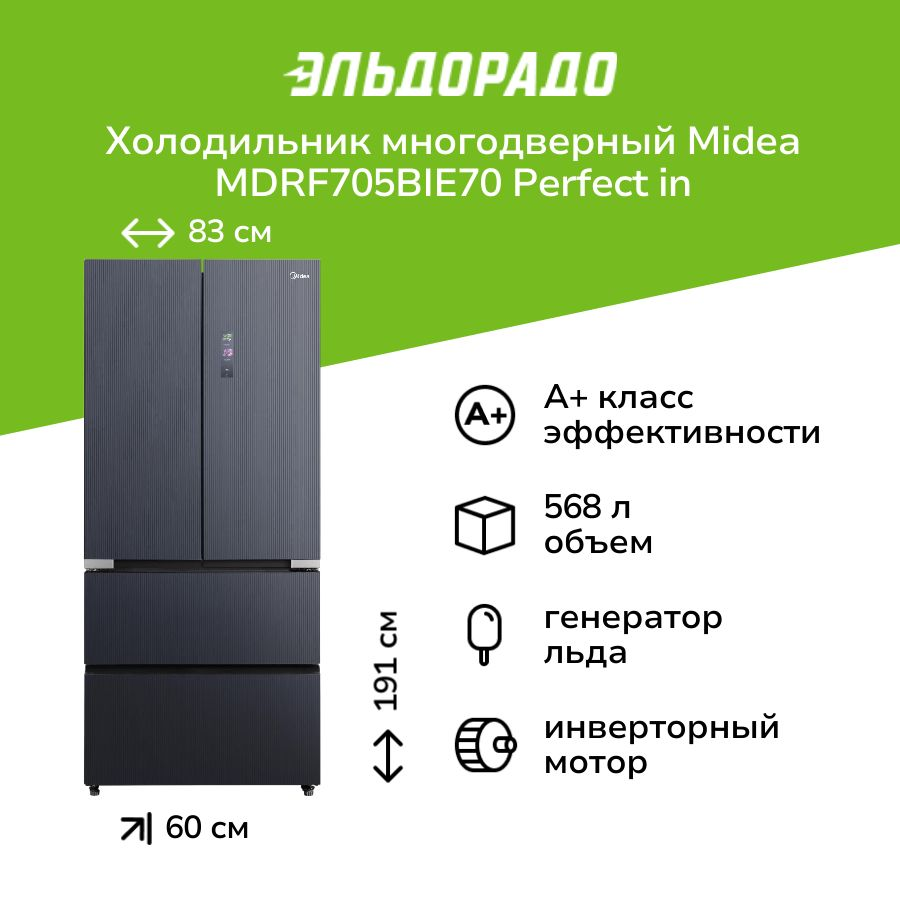 Холодильник Midea MDRF705BIE70 с нижним расположением морозильной камеры работает под управлением тихого (до 38 дБ) инверторного компрессора и относится к классу энергоэффективности А+. Прибор оснащен двумя распашными и двумя выдвижными дверцами с утопленными ручками, внешний сенсорный блок управления обеспечивает простое управление настройками. • Холодильное отделение полезным объемом 359 л Поддерживает температуру от 2°С до 8°С и включает три стеклянные полки, шесть дверных полок с бортиками, подставку для яиц, три ящика в сухой зоне свежести. Светодиодная лампа мощностью 11 Вт обеспечивает хороший обзор всех уровней. • Морозильное отделение полезным объемом 175 л Состоит из двух выдвижных полок, в которых поддерживается температура от -16°С до -24°С. Мощность замораживания составляет 8 кг в сутки. • Система No Frost Распределяет холодный воздух по всему объему камер, предупреждая образование инея и наледи на внутренних стенках, что исключает ручное размораживание. • Управление со смартфона Приложение MSmartHome позволяет контролировать работу прибора дистанционно. • Антибактериальная защита Plasma Pure Создает отрицательные и положительные ионы, которые снижают активность бактерий и поглощают запахи, сохраняя свежесть продуктов. Прибор поддерживает режимы Суперзаморозка и Суперохлаждение, что ускоряет процесс обработки загруженных продуктов. Энергоэффективный режим Отпуск полезен, когда в камере отсутствует скоропортящаяся еда. При отключении от электросети морозильное отделение поддерживает холод в течение 7 часов.