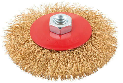 Тип «колесо», с наклоном, гайка М14. Для шлифовальных и отрезных машин. Материал: стальная, латунированная, волнистая проволока. Упаковка: картонная коробка.