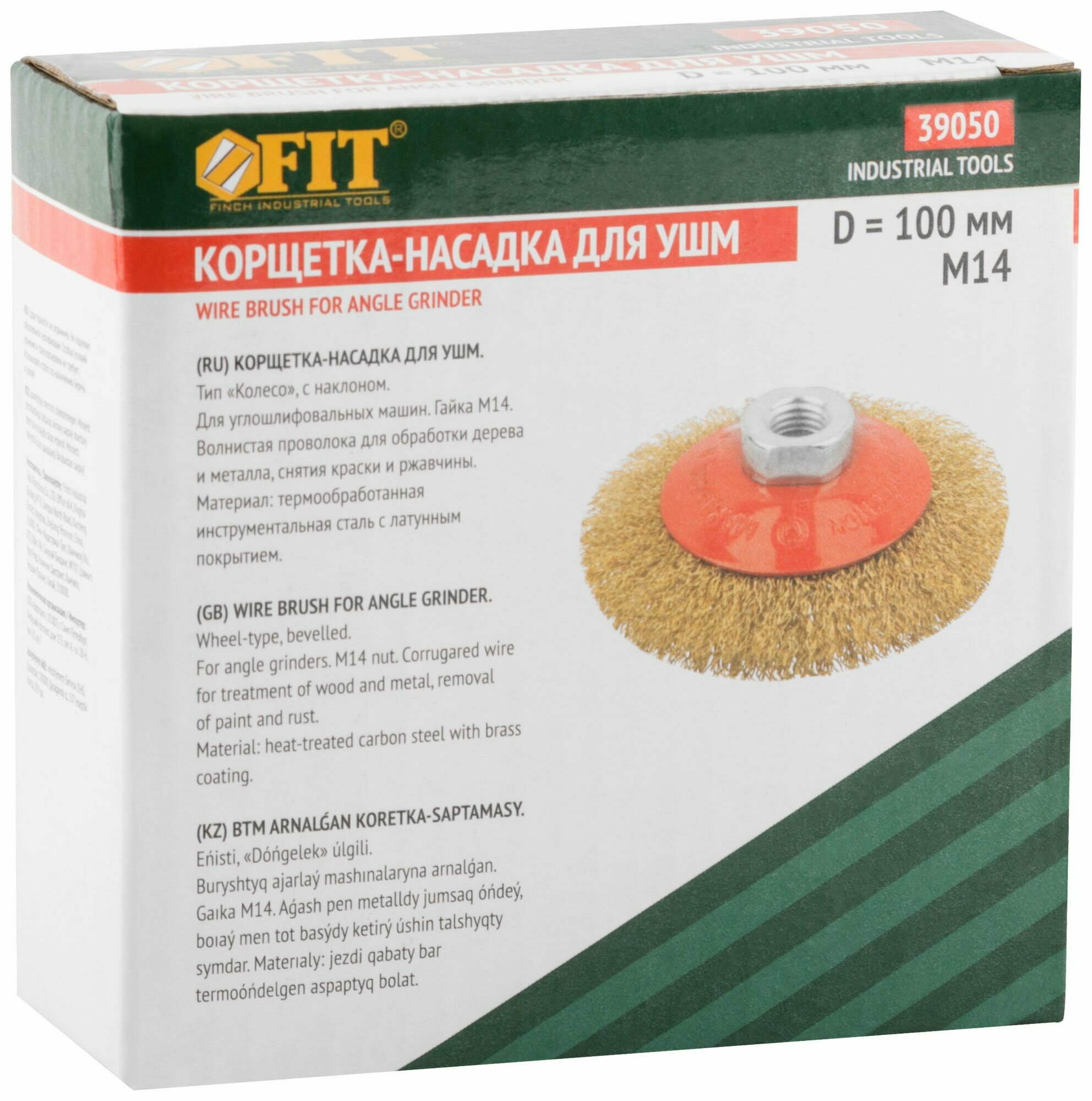 Корщетка-колесо с наклоном FIT , гайка М14, стальная волнистая латунированная проволока 100 мм