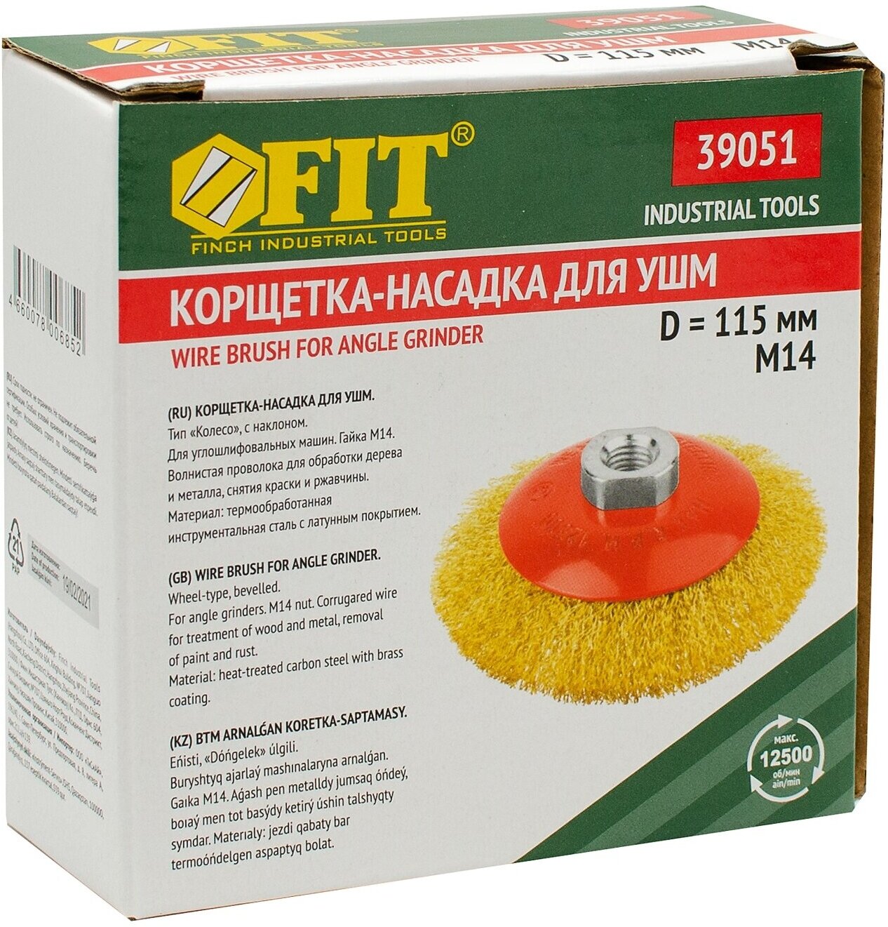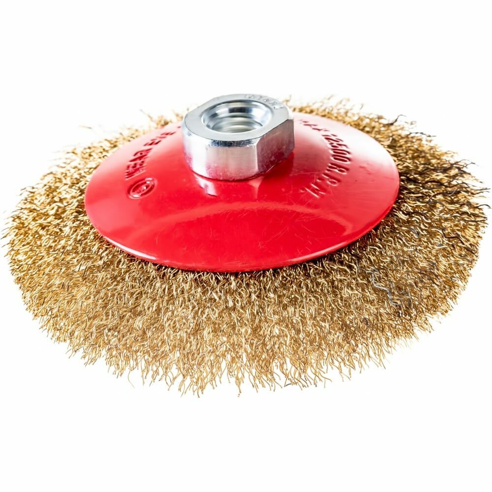 Корщетка-колесо с наклоном FIT , гайка М14, стальная волнистая латунированная проволока 115 мм
