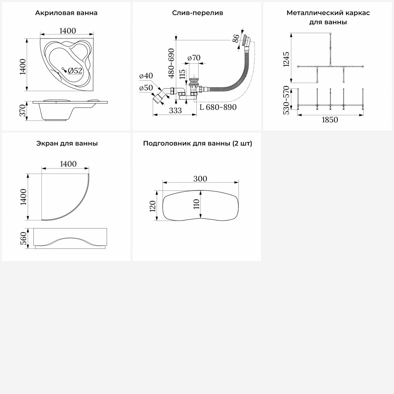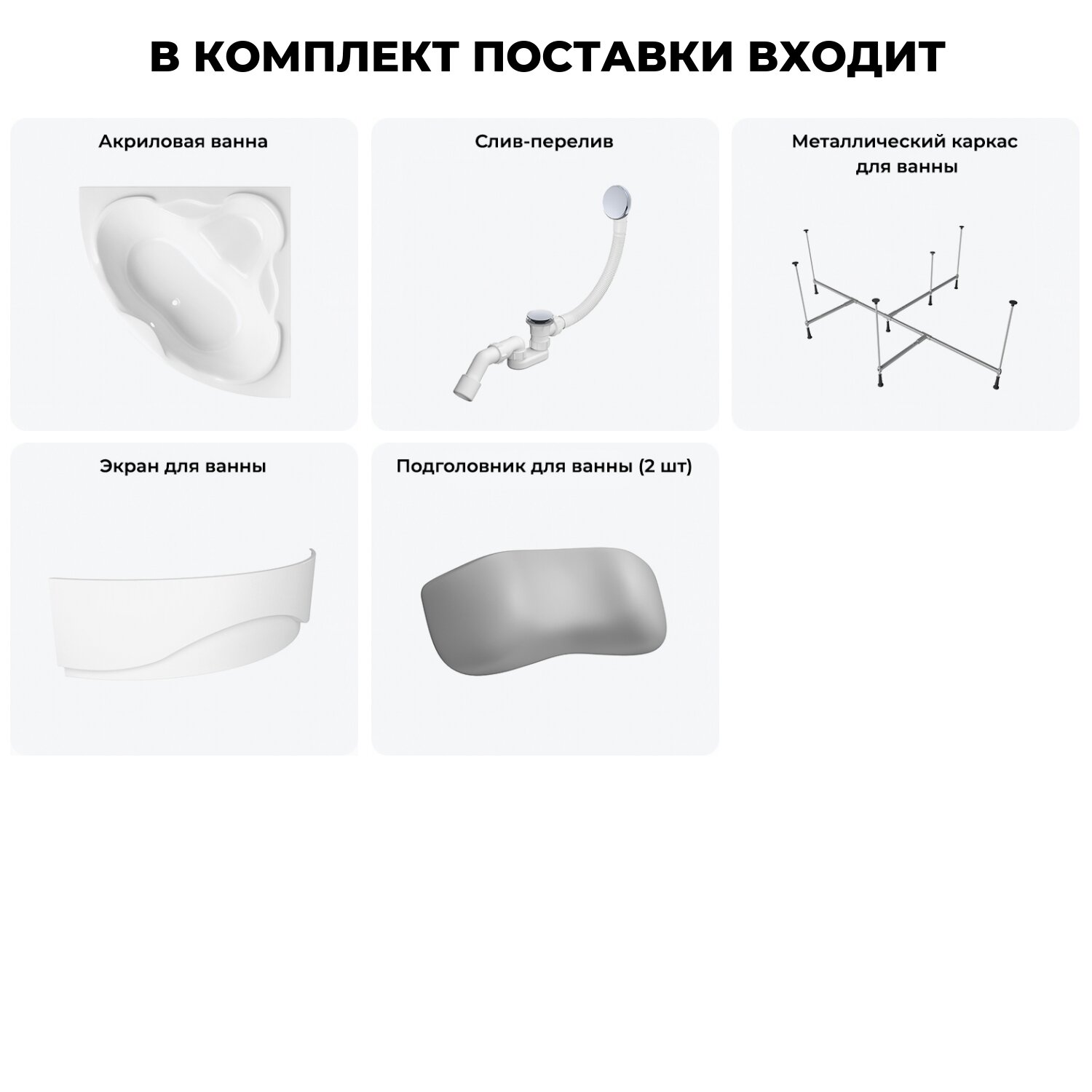 | Дополнительная информация | в наборе 5 в 1:акриловая ванна, каркас, экран, слив-перелив, подголовник |
