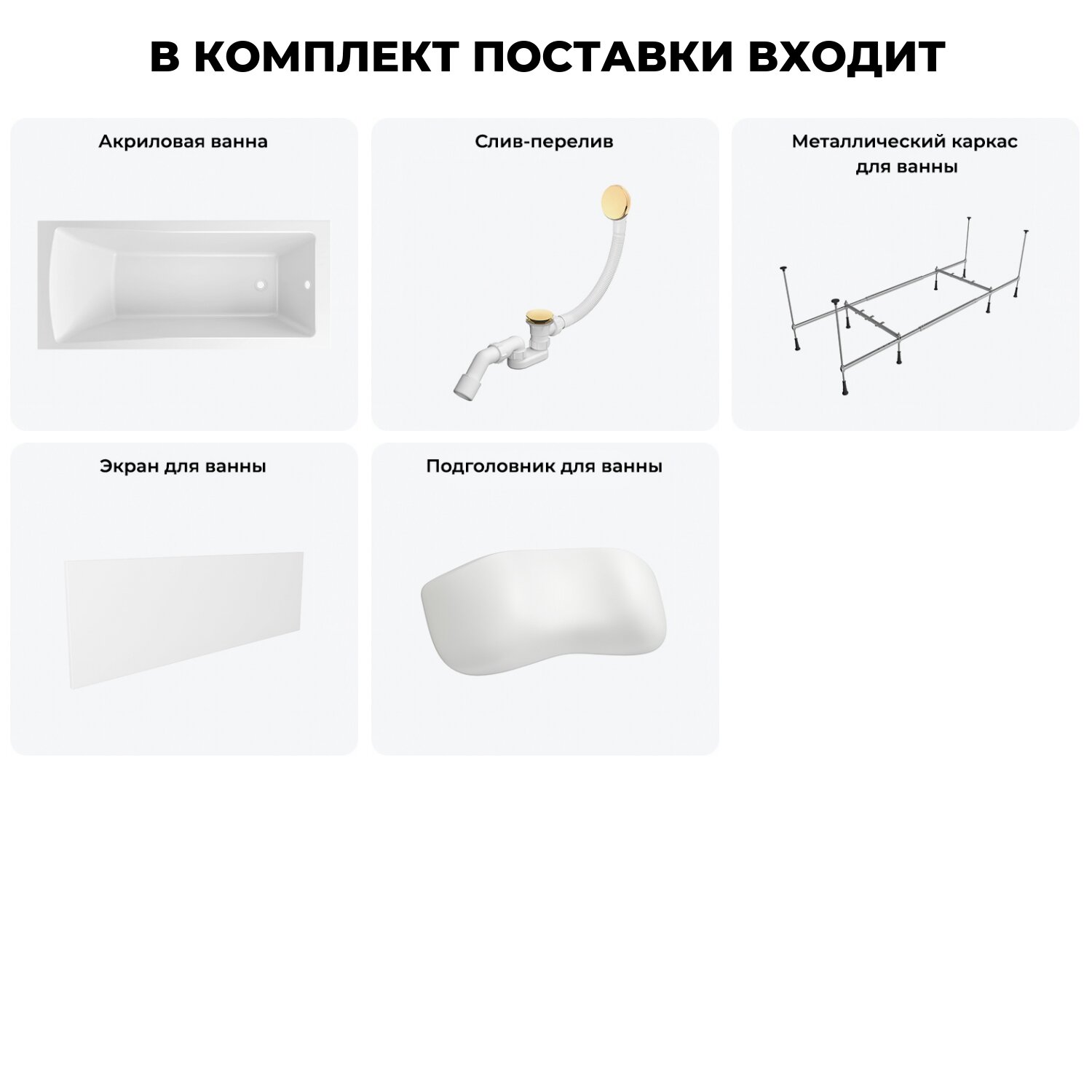 | Дополнительная информация | в наборе 5 в 1:акриловая ванна, каркас, экран, слив-перелив, подголовник |