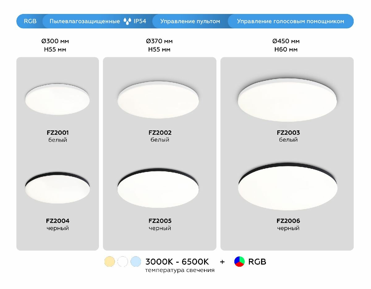 | Номенклатура | FZ2002 WH белый IP54 25W 3000K-6500K+RGB Wi-Fi Алиса/Tuya/Smart Home/Alexa D370*55 (ПДУ ИК) |