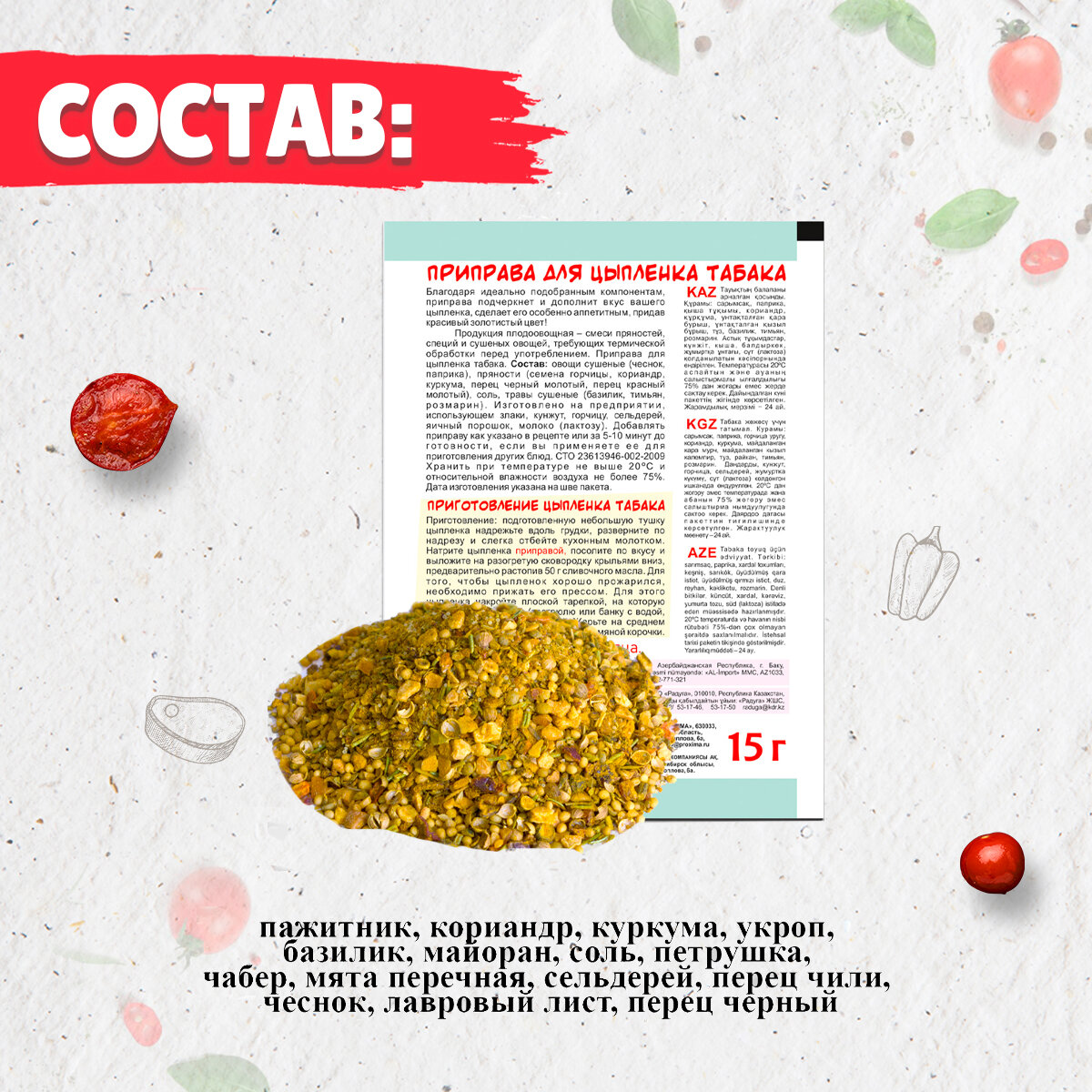 Благодаря идеально подобранным компонентам, наша приправа подчеркнёт и дополнит вкус Вашего цыплёнка, сделает его особенно аппетитным, придав красивый золотистый цвет! Состав: перец черный молотый, перец красный молотый, паприка, кориандр молотый, лавровый лист, карри, хмели-сунели, куркума, семя горчицы, чеснок, розмарин, тимьян, базилик, соль.