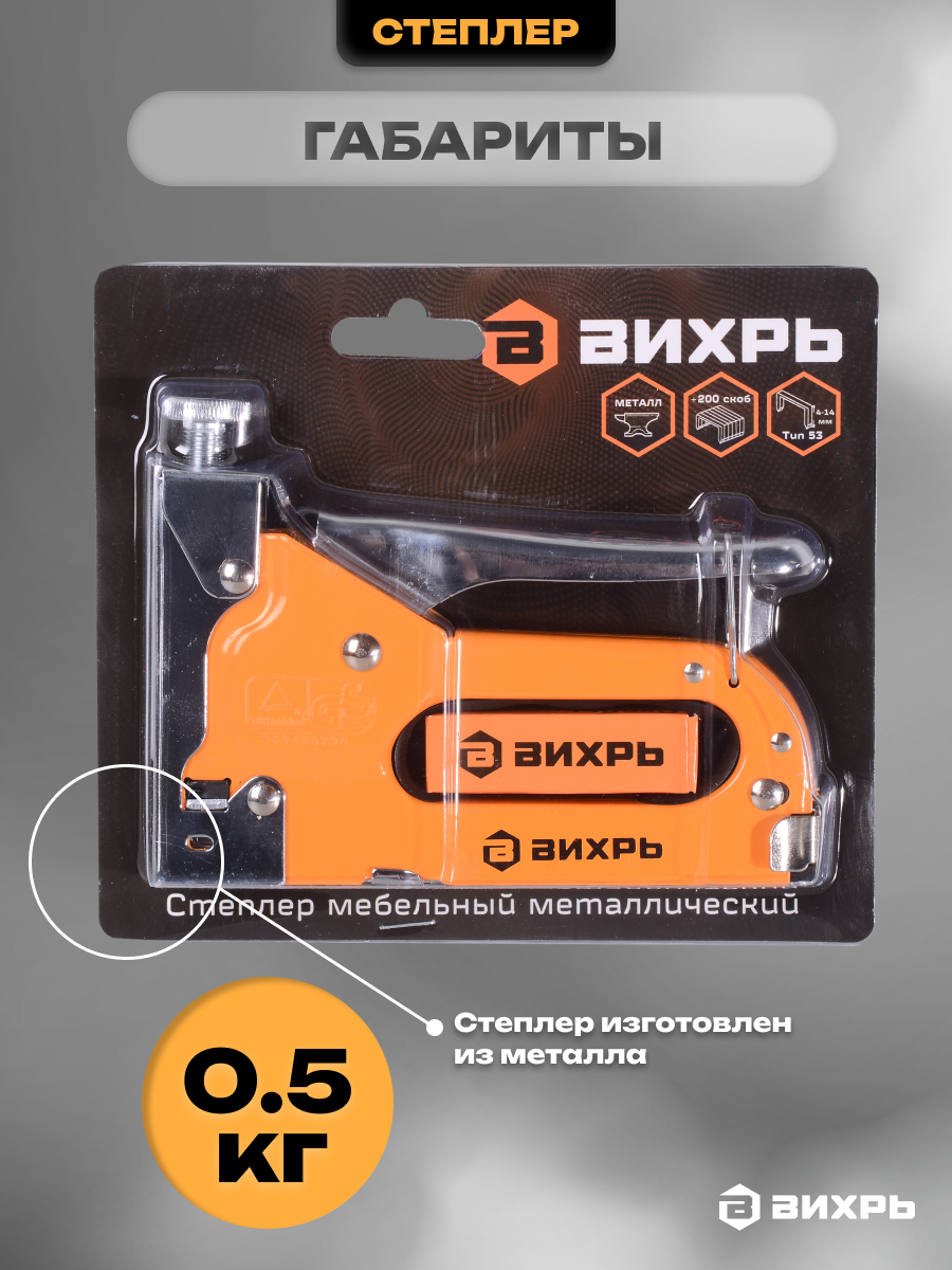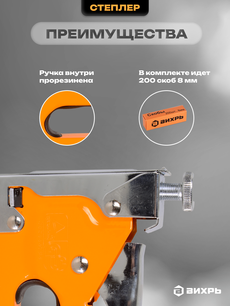 Степлер электрический ЭСТ-2400 Вихрь это удобное изделие для разнообразных работ: скрепления деталей, фиксации материалов, закрепления подвесных элементов и многого другого. Сочетает в себе большую силу удара с плавной регулировкой, встроенный магазин большой емкости - все что надо для комфортной, безопасной и длительной работы. Применяется для крепления различных материалов (тканей, пленок, кожи, панелей и т.д.), а также для соединения изделий из различных материалов (дерева, пластика) при строительных, отделочных и ремонтных работах. ЭСТ-2400 Вихрь имеет защиту от случайного срабатывания. Охлаждение двигателя. Вентиляционные отверстия на корпусе способствуют оптимальному охлаждению двигателя. Модель оснащена удобной рукояткой с прорезиненными вставками для надежного хвата без проскальзывания руки.