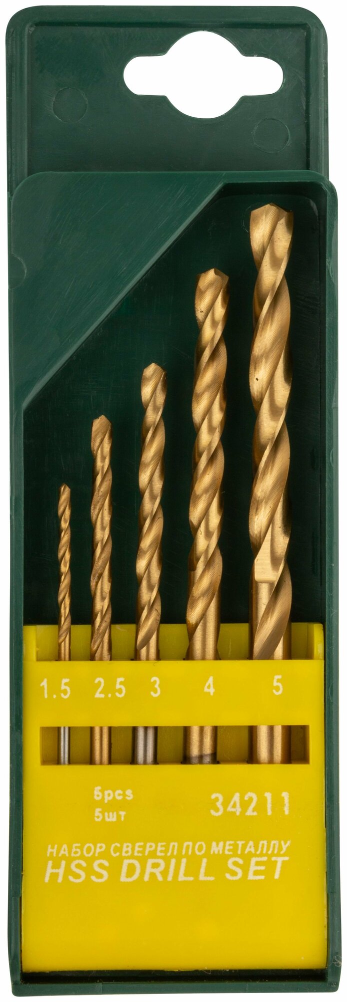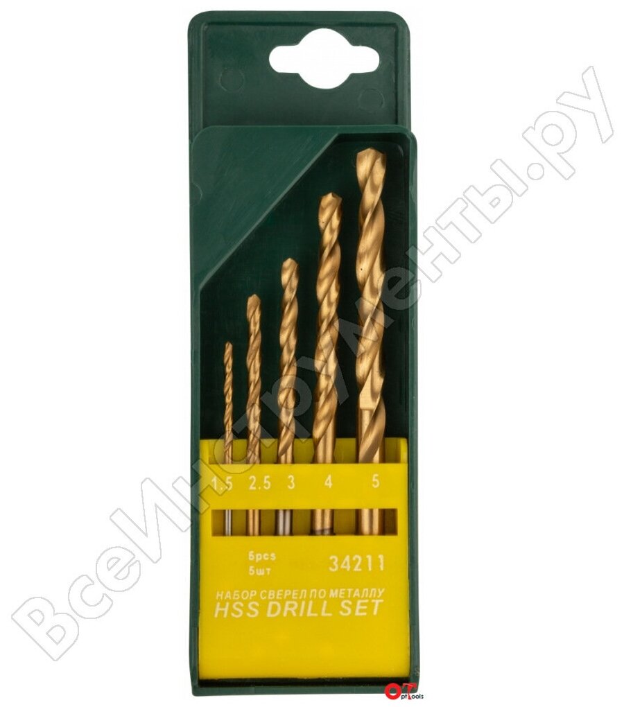 Набор 5 шт. в пластиковом боксе (1,5-2,5-3-4-5 мм). Цилиндрический хвостовик. Материал: быстрорежущая (HSS) сталь Р9М3 c титановым покрытием, вышлифованный профиль. Угол заточки 135 градусов. Класс точности А1.