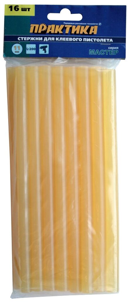 Стержни для клеевого пистолета ПРАКТИКА - предназначены для прочного соединения деталей из картона, полимерных материалов, линолеума, кожи, ткани, резины, керамики, фарфора, стекла. Температура плавления 85°С. Время застывания 35-40 с. Упаковка - блистер.