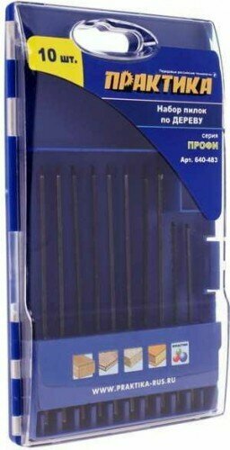 Садовый инструмент Практика ПРАКТИКА - набор пилок для лобзика по дереву. Данный набор включает в себя 10 пилок различных типов: T101B по дереву и ДСП с чистым резом, T144D по дереву и ДСП с грубым резом, T101D по дереву и ДСП с быстрым резом, T101AO по дереву, пластику, ламинату и ДСП с криволинейным чистым резом, T127D для алюминиевого профиля с быстрым резом, T218A по листовой стали и профиля с криволинейным чистым резом, T118A по листовой стали и профиля с чистым резом.