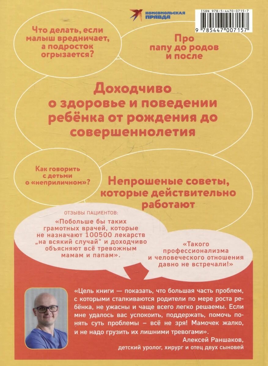 «Мамочек жалко! Руководство к ребенку, которое могли бы давать в роддоме» – бережная поддержка для всех тревожных мам. Детский уролог, хирург, папа двух малышей Алексей Раншаков без сложных медицинских терминов и с юмором рассказывает про все этапы жизни ребенка – от рождения до выпускного. Вы поймете, когда действительно стоит волноваться, а когда точно нет. Цель книги – показать, что большая часть проблем, с которыми сталкиваются родители по мере роста ребенка, не ужасны и чаще всего легко решаемы. Не зря пациенты довольны — «Побольше бы таких грамотных врачей, которые не назначают 100500 лекарств «на всякий случай» и доходчиво объясняют все тревожным мамам и папам». Автор книги на конкретных примерах разъясняет о подводных камнях прикорма (мясо лучше, чем кабачок) и приучения к горшку, о том, какие дела стоит делегировать папе и как быть, если папа отлынивает, какую простуду считать «заразной»; дает дельные советы, как пережить трехлетний и подростковый кризисы, и еще очень много полезных рекомендаций на каждый день для родителей. «Моя цель – чтобы в жизни родителей было меньше беспокойства», – говорит доктор Раншаков. Ребенок – не только главное действующее лицо книги, но и полноценный соавтор, что делает чтение увлекательным!