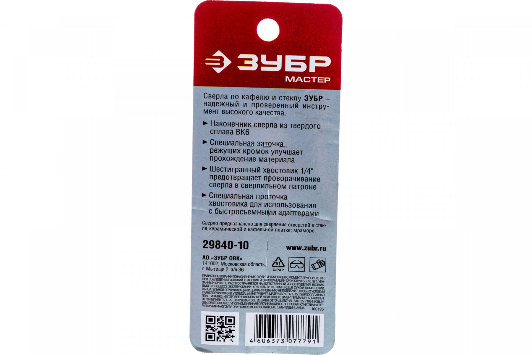 | Прочие особенности и свойства | Сверло ЗУБР 29840-10 ''МАСТЕР'' по кафелю керамике с двумя режущими лезвиями 10мм |