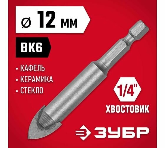 Сверло "мастер" Зубр 29840-12 используется для сверления отверстий в кафеле, керамике и стекле с помощью электродрели. Оснастка имеет шестигранный хвостовик для надежной фиксации в патроне, а также твердосплавные пластины ВК6 с отшлифованными режущими кромками для эффективной работы. Сверло имеет два режущих лезвия. Благодаря специальной проточке хвостовика 1/4 дюйма возможно использование с быстросъёмным адаптером. Рекомендуется охлаждение водой.