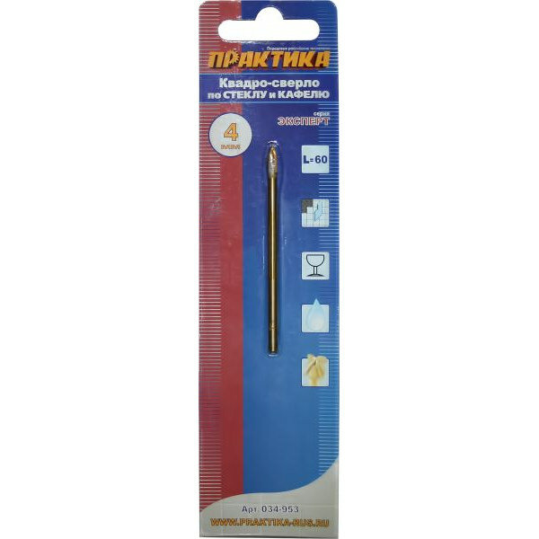 Сверло по стеклу ПРАКТИКА 034-953 4мм Квадро по стеклу и кафелю