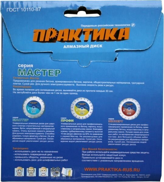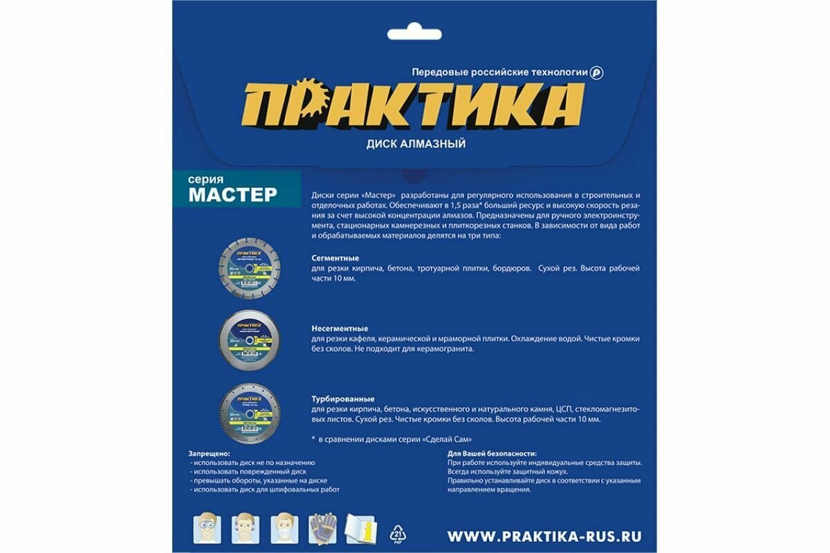 Садовый инструмент Практика 030-672 ПРАКТИКА 030-672 - предназначен для резания бетона, армированного бетона, кирпича, общестроительных материалов, тротуарной плитки. Сухой рез. Для ручного электроинструмента. Высокая скорость реза и ресурс. Во время пиления для охлаждения диска, вынимайте диск из пропила каждые 30 секунд. Не заглубляйте диск более чем на 1 см за один проход.