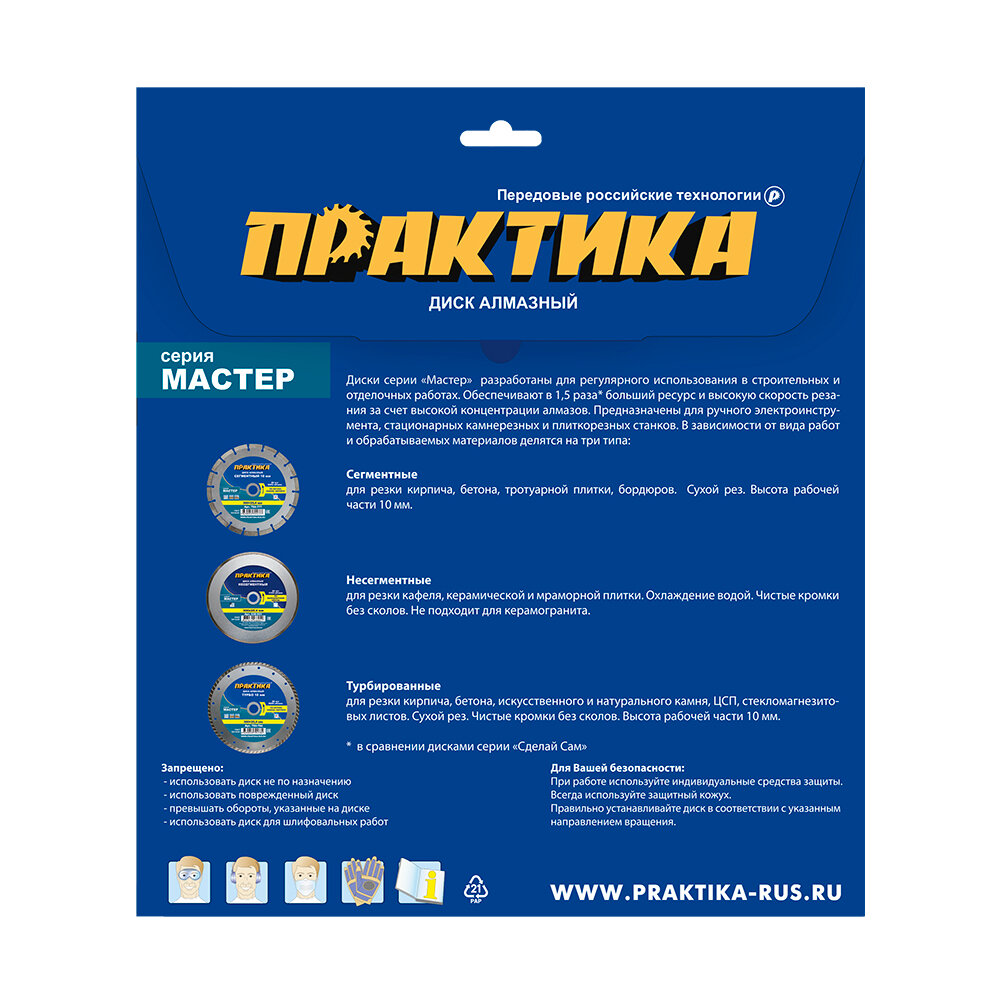 Серия «Мастер». Тип TURBO. Сегмент 10 мм. ГОСТ 10110-87. Алмазные диски для широкого спектра строительных материалов: кирпич, бетон, искусственный и натуральный камень. Очень высокая скорость резания. Для ручного электроинструмента. Способны разрезать тонкую арматуру в бетоне. Не для абразивных материалов. Сухой рез. Охлаждение водой увеличивает ресурс диска.