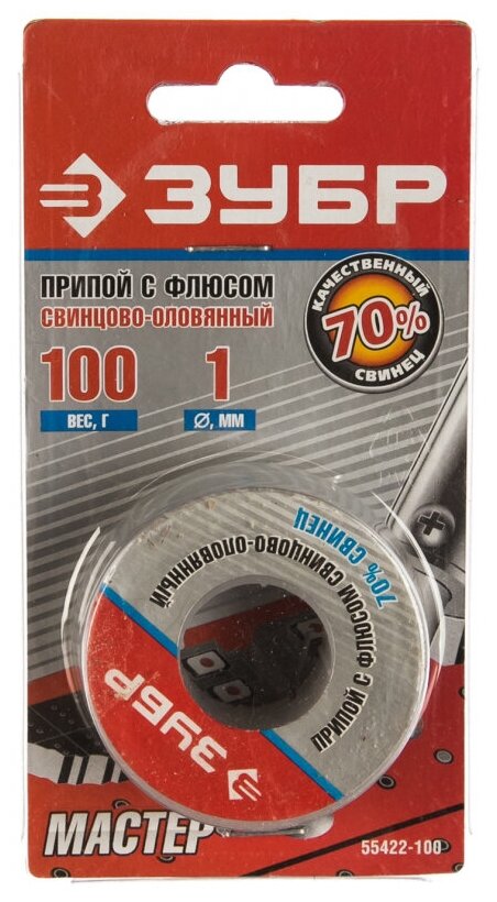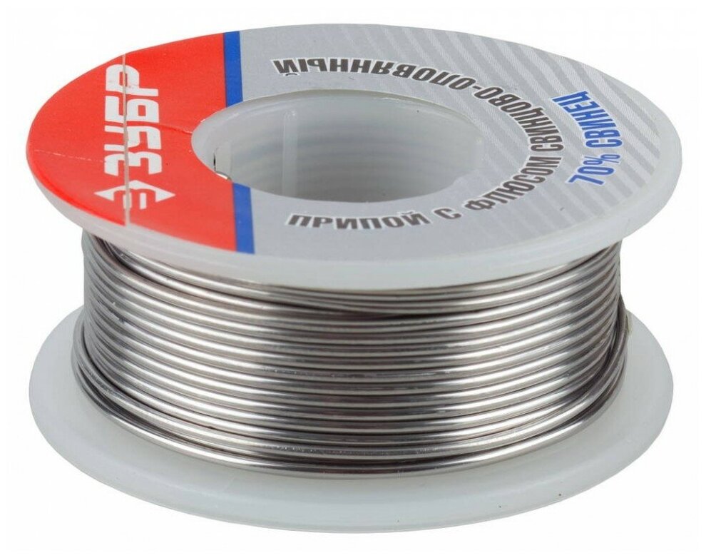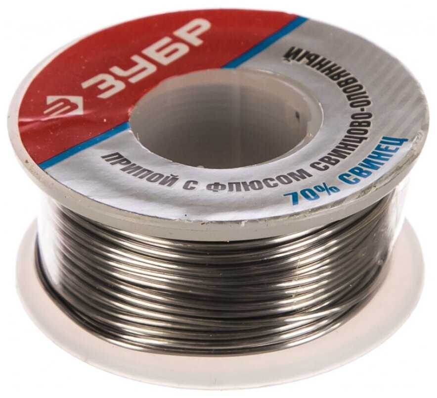 Припой ЗУБР Sn30 % pB 70 % 100гр ()Модель - Технические характеристики:-Содержание олова: 30 %-Содержание свинца: 70 %-Вес: 100 гр.Припой оловянно-свинцовый – высококачественный сплав для пайки и лужения элементов электро- и радиоаппаратуры, печатных схем, точных приборов с высокогерметичными швами, медных проводов максимальная температура нагрева которых не должна превышать 200? С. Оловянно-свинцовые припои торговой марки изготовлены из качественных компонентов и обеспечивают надежную пайку.Преимущества:-• Внутри полой проволоки припоя находится сердечник флюса;-Диаметр проволоки 1 мм;-Функциональная и компактная упаковка для удобства использования, хранения и переноски;