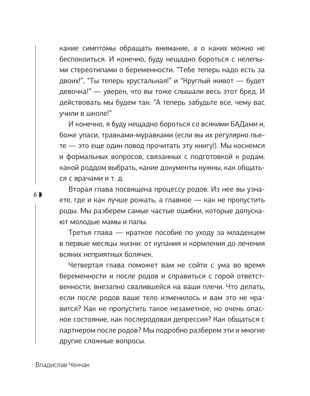 В своей книге автор подробно рассказывает о каждом этапе беременности и первых месяцах жизни ребенка. Опираясь на доказательную медицину, Владислав Ченчак с юмором и иронией развенчивает мифы о беременности, оставляя место только проверенным фактам и рекомендациям.