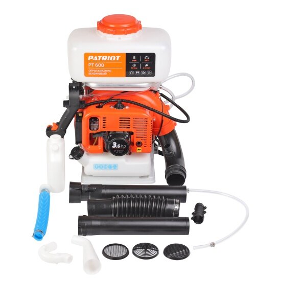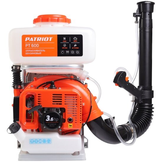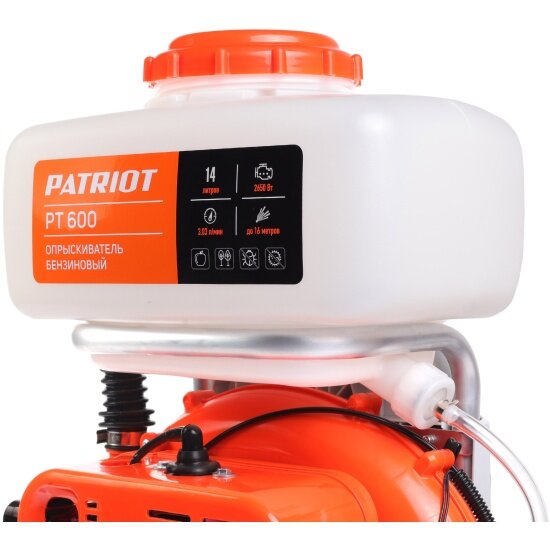 Опрыскиватель бензиновый PT 600 (макс. производительность 3,03 л/мин, макс. дальность распыления жидкости 16 м) для полива огорода, сада или дачи. Садовый опрыскиватель ручной подойдет для обработки деревьев, кустарников и цветов, клумб. Устройство с большим радиусом распыления. Функция распыления порошковой смеси позволяет эффективно использовать удобрения и пестициды. Максимальная дальность распыления 18 метров обеспечивает точное и равномерное распределение сухих веществ по обрабатываемой поверхности. Распылитель садовый для деревьев позволит достичь отличного результата в уходе за растениями. Опрыскиватель для растений с 2-х тактным бензиновым двигателем имеет объем топливного бака 1,5 л. Опрыскиватель садовый с двигателем мощностью 3,6 л.с (частота вращения 8000 об/мин). Антивибрационная система уменьшает вибрации, создаваемые двигателем. Это делает работу комфортнее для пользователя. Крепкий пластиковый бак подойдет для химических растворов и удобрений. Опрыскиватель патриот взаимодействует с такими веществами как инсектициды, фунгициды, гербициды. Ранцевый рюкзак опрыскиватель снабжен удобной системой переноски. Во время работы вес устройства с полным баком 14 литров равномерно распределяется. Бак с большим заливным отверстием удобно наполнять и очищать. Опрыскиватель для деревьев с пустым баком весит 13,2 кг.Нет необходимости постоянно носить бензиновый опрыскиватель на спине. Шланг обеспечит комфортную работу обеими руками, позволяя просто поставить устройство на землю рядом, что позволяет работать любому пользователю.! Совет от производителя:Больше всего подходит распылитель для воды и близких к ней по вязкости жидкостей. Использование более вязких жидкостей значительно сократит срок службы устройства.Производитель рекомендует использовать масло для двухтактного двигателя G-Motion Garden и G-Motion Euro. Масло смешивается с бензином в пропорции 1:40 (масло + бензин АИ-92) и только после этого заливается в топливный бак.