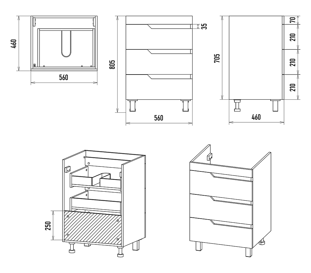 - Габариты корпуса тумбы (ШхВхГ): 560х805х460 мм.