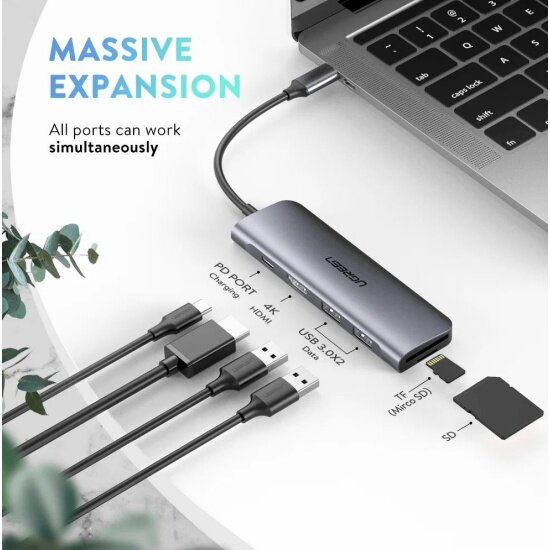 USB-хаб UGREEN CM195 USB Type-C (3xUSB 3.0 Type-A HDMI SD microSD) Серый Док-станция 70410