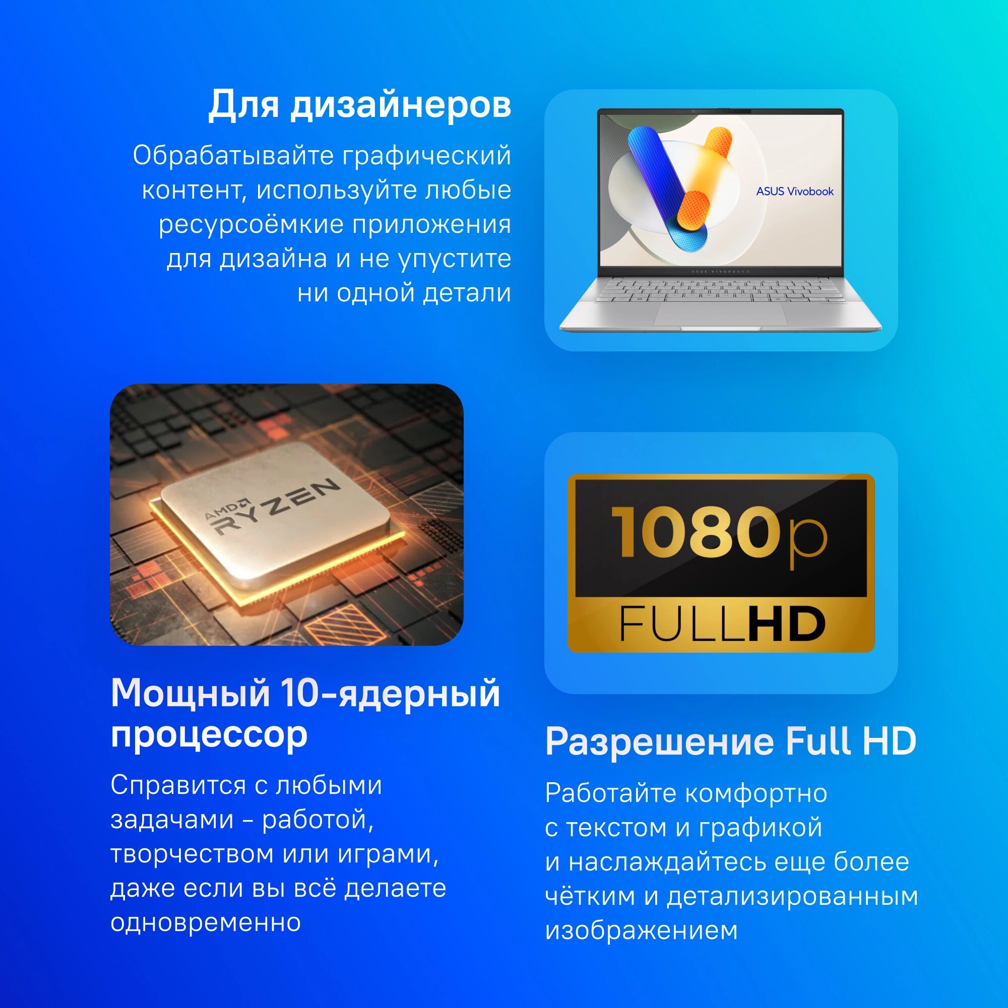 Ноутбук ASUS VivoBook S14 получил мощную конфигурацию на базе десятиядерного процессора AMD Ryzen AI 9 365, который способен справиться с любыми ресурсоемкими задачами (от профессиональной обработки фото и видеомонтажа до 3D-моделирования). Нейронный сопроцессор позволяет ускорить работу приложений, которые используют искусственный интеллект. Интегрированная видеокарта AMD Radeon 880M обеспечивает высокую производительность при работе с программами Adobe Photoshop, Lightroom и DaVinci Resolve. Также можно комфортно играть в современные игры (например, World of Warcraft, League of Legends, Мир танков и др.) в разрешении Full HD.Преимущества:ударопрочный корпус;клавиатура с настраиваемой RGB-подсветкой;активное охлаждение;быстрая зарядка 90 Вт.Благодаря 24 ГБ оперативной памяти LPDDR5x можно одновременно работать с большим количеством приложений и открывать сотни вкладок в браузере, а твердотельный диск объемом 1 ТБ гарантирует мгновенный доступ к файлам. Дополнительно предусмотрен кардридер для установки и считывания информации с microSD-карты.OLED-панель14-дюймовый дисплей с WUXGA-разрешением, поддержкой стандарта HDR и цветовым охватом 100% DCI-P3 подойдет для самых разных сценариев использования: от просмотра видеороликов и веб-серфинга до чтения электронных книг и дизайна. Функция «Мультиэкран» позволит дублировать изображение с экрана смартфона или планшета на компьютер, благодаря чему можно эффективнее работать с несколькими устройствами. Технология защиты зрения снижает нагрузку на глаза.Мультимедийные особенностиВстроенная FHD-камера 2 Мп поддерживает разблокировку по лицу и имеет защитную шторку для сохранения конфиденциальности в офисе или общественном месте. Стереодинамики Harman Kardon обеспечивают громкий и чистый звук с эффектом объемного звучания при прослушивании музыки или общении по видеосвязи. Подключить проводные наушники или микрофон можно через комбинированный аудиоразъем.ИнтерфейсыМодель оснащена двумя полноразмерными USB-портами версии 3.0 и парой универсальных разъемов Type-C, которые можно использовать для передачи видео и подзарядки аккумулятора. Также присутствует видеовыход HDMI.