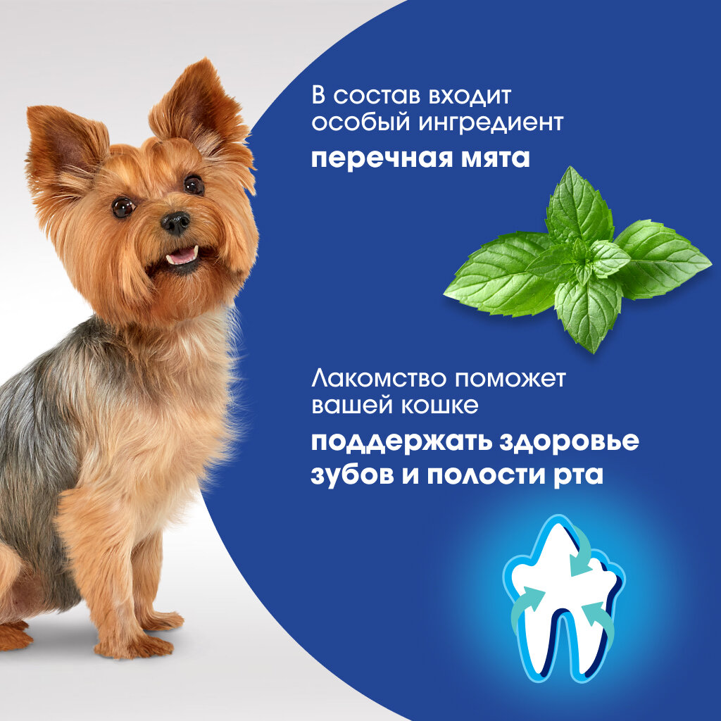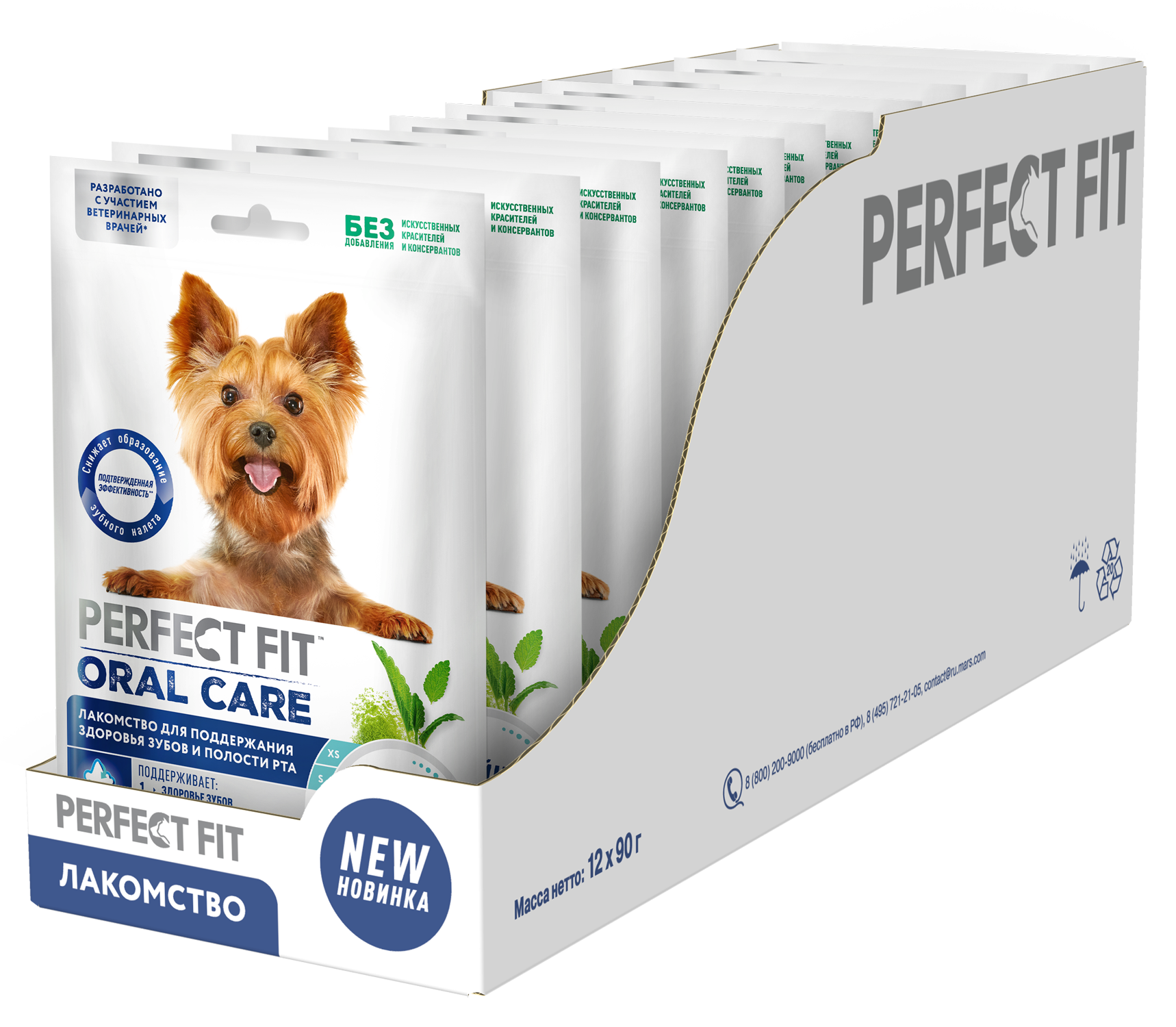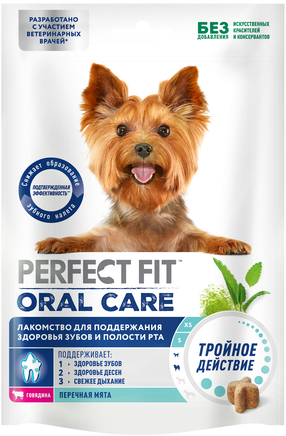 Функциональные лакомства PERFECT FIT™ - это линейка профессиональных лакомств, созданная специально для ежедневного ухода за здоровьем вашего питомца. Функциональное лакомство PERFECT FIT™ с говядиной и добавлением перечной мяты обладает тройным действием: поддерживает здоровье зубов, десен и свежесть дыхания вашей собаки мелкой или миниатюрной породы. Комплекс витаминов и минералов, особая текстура и специальный компонент STPP (триполифосфат натрия) помогают организму поддержать здоровье зубов и полости рта при соблюдении рекомендаций по кормлению. Лакомство обладает подтвержденной эффективностью в снижении образования зубного налета, согласно исследованиям. Функциональное лакомство PERFECT FIT™ ORAL CARE подходит для щенков от 4 месяцев и стерилизованных собак. В основе рецептуры функционального лакомства PERFECT FIT™ ORAL CARE лежит особая формула, разработанная совместно с ветеринарными врачами Центра изучения питания домашних животных ООО «Марс». Лакомство производится без добавления искусственных красителей и консервантов. В линейке функциональных лакомств PERFECT FIT™ представлены лакомства, которые закрывают потребности в поддержании крепкого иммунитета кошек и собак, здоровья зубов и полости рта кошек и собак, а также здоровья суставов собак.