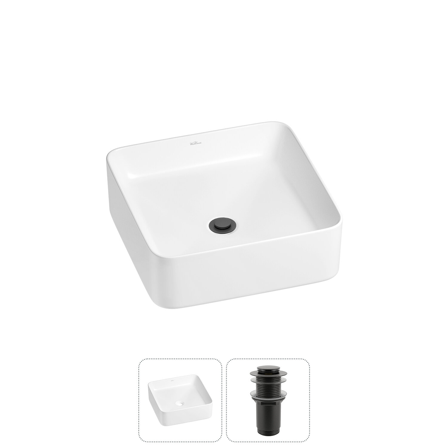 Накладная раковина для ванной комнаты Wellsee Mint в наборе 2 в 1 1. 1 х керамическая раковина, арт 2. 338101000 (размер 37*37 см, цвет глянцевый белый); 1 х донный клапан для раковины, арт 3. 182135000 (цвет матовый черный); 1 x инструкция по монтажу и эксплуатации; 1 x гарантийный талонСмотри также характеристики.