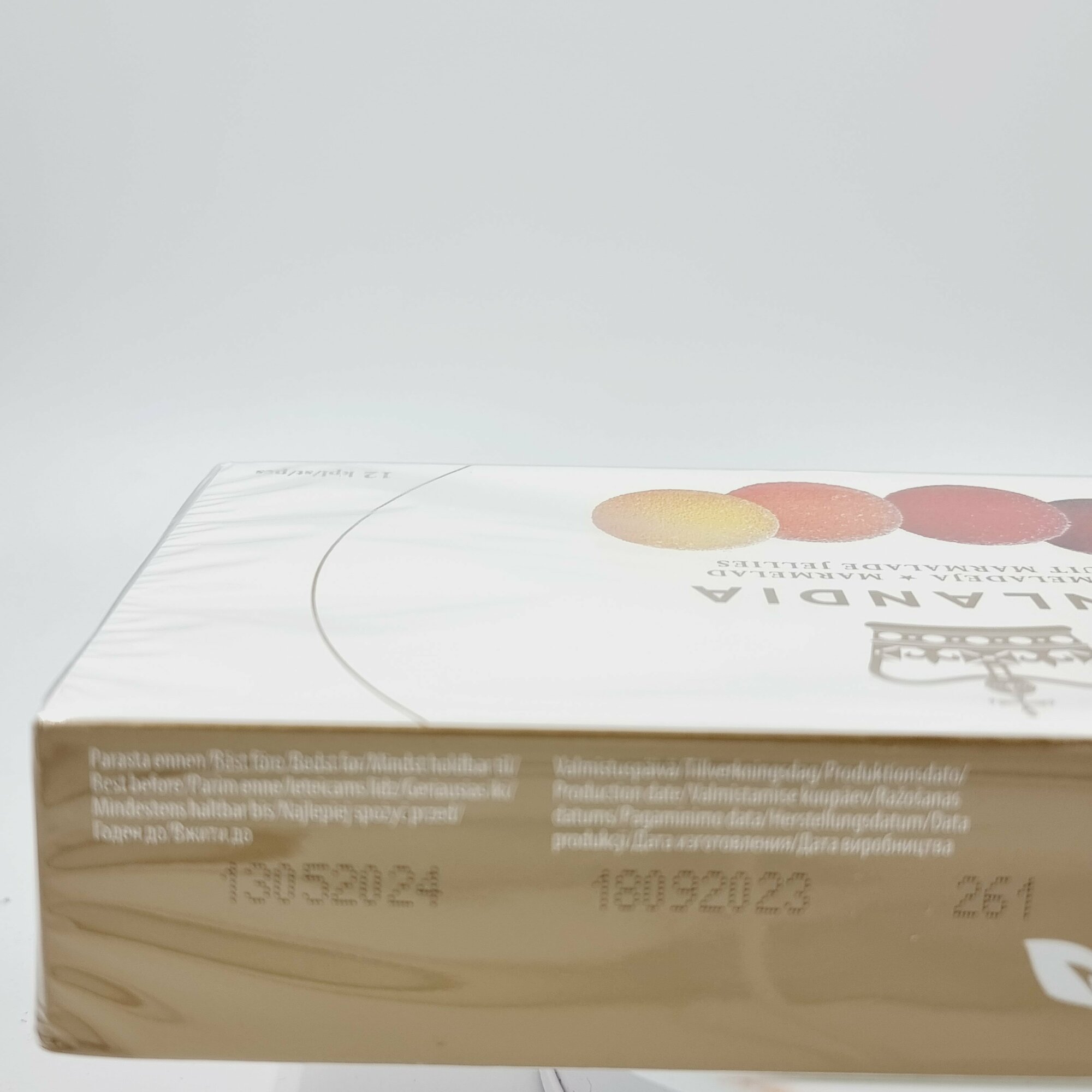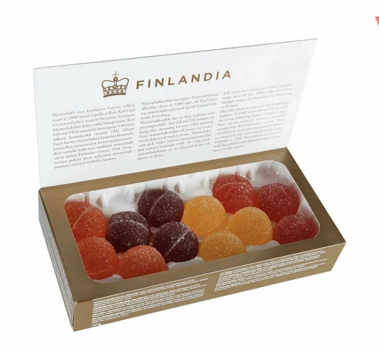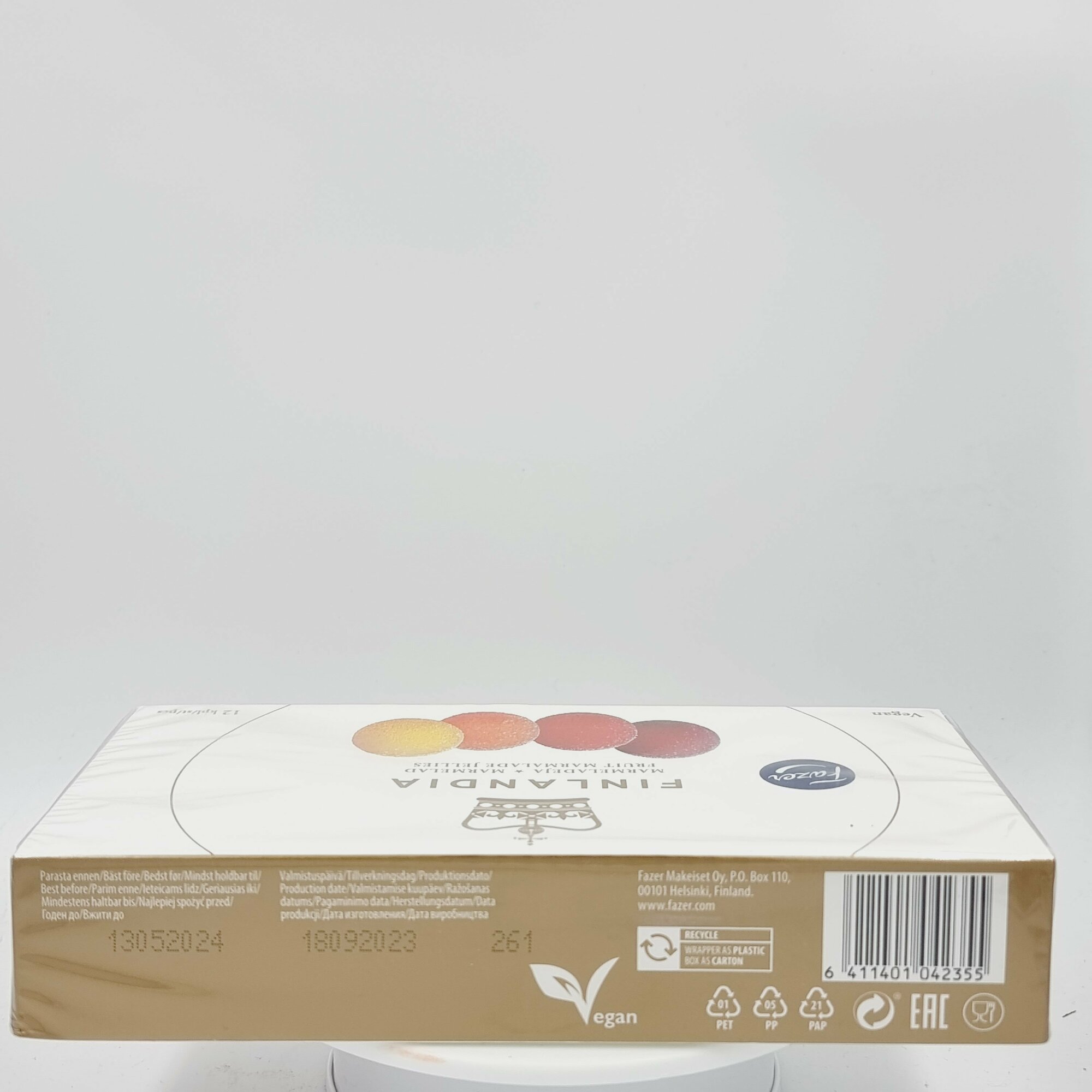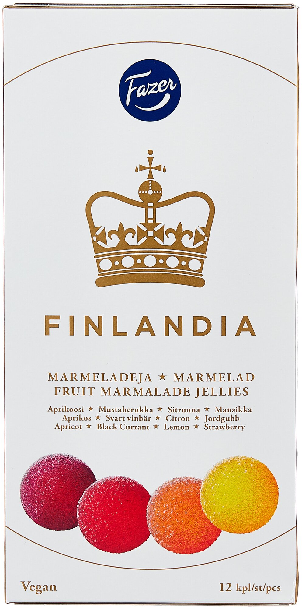 Мармелад Finlandia от Fazer изменит ваше представление о мармеладе! Роскошный праздничный мармелад премиального качества — ассорти из 4 классических фруктовых вкусов, в форме искрящихся шариков, красиво сервированных в элегантной коробке. Нежный абрикос, сладкий лимон, черная смородина и клубника — лакомство от которого невозможно оторваться. Не содержит желатин, вегетарианский, постный продукт. Вес: 260 г. Состав: сахар, сироп глюкозный, вода, желирующий агент (Е 440), регуляторы кислотности (Е 330, E337), пищевые красители (концентрат батата, яблока и сафлора), ароматизаторы, красители (Е163, Е160а). Пищевая ценность: жиры — 79 г. Энергетическая ценность: 320 ккал. Срок годности: 8 месяцев. Хранить в сухом месте при температуре от +16 до +20 °C. Страна производства: Финляндия. Производитель: Fazer Confectionery Ltd, PL 110, Финляндия, 00101 Хельсинки.