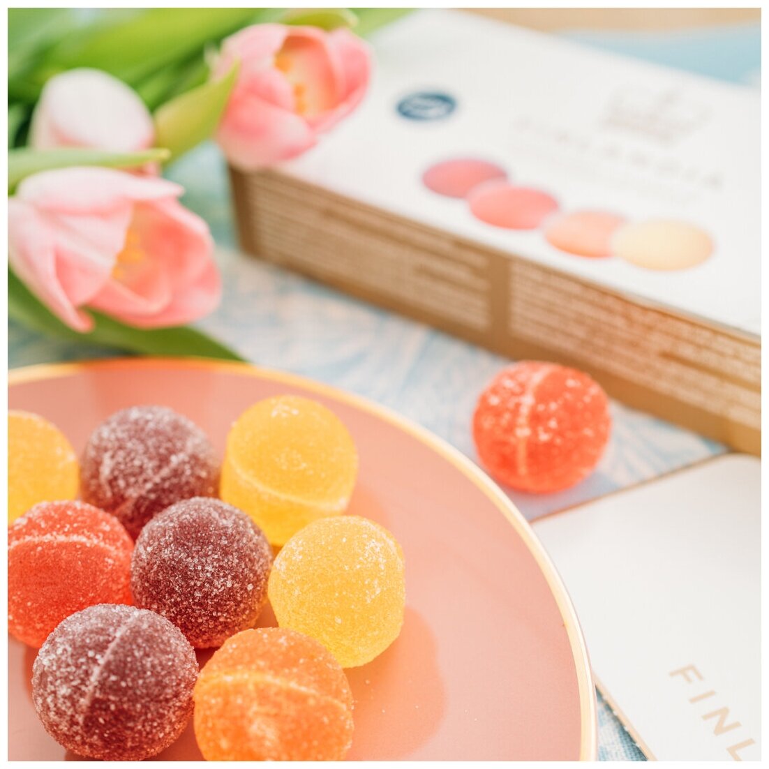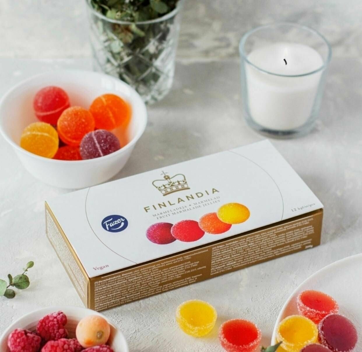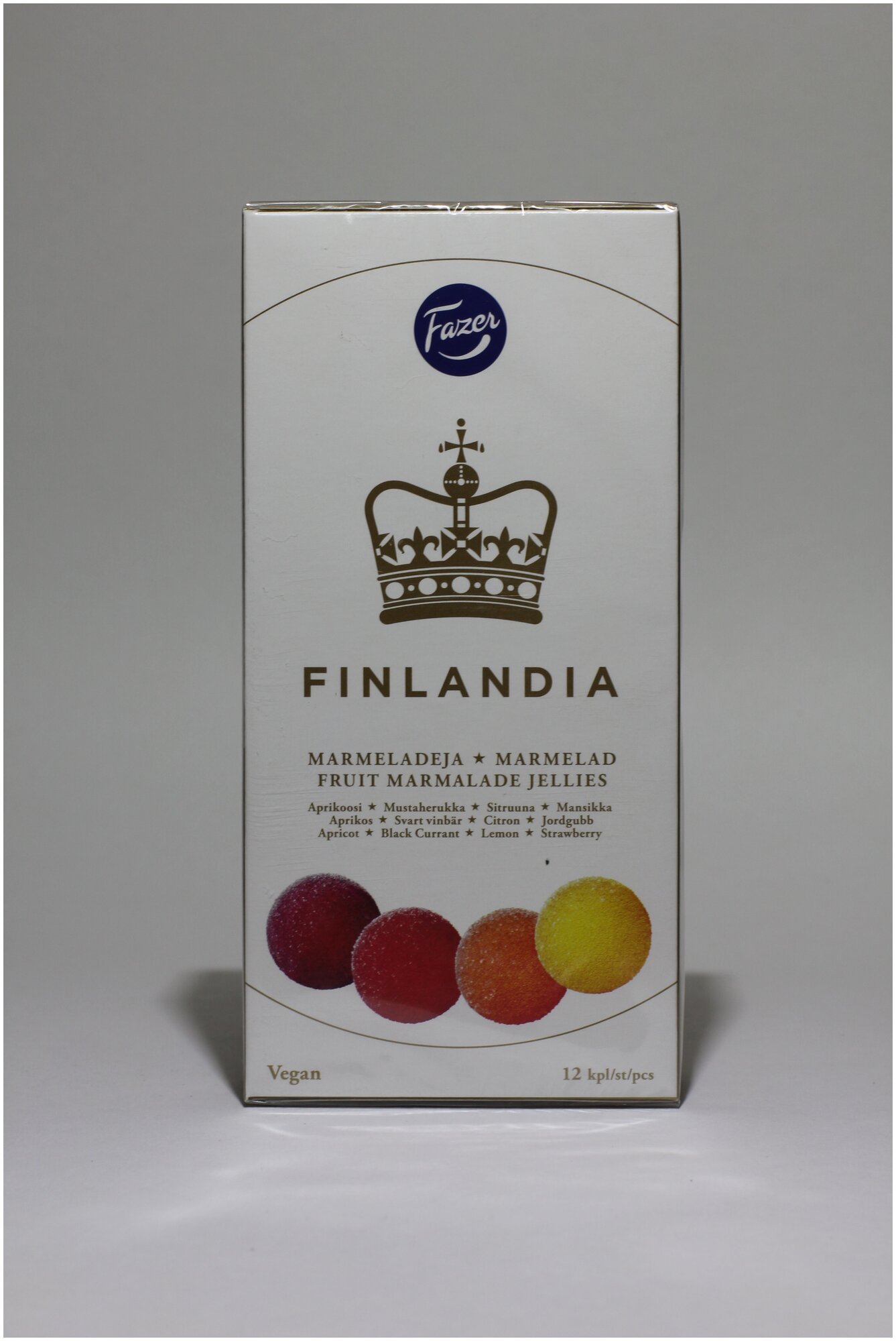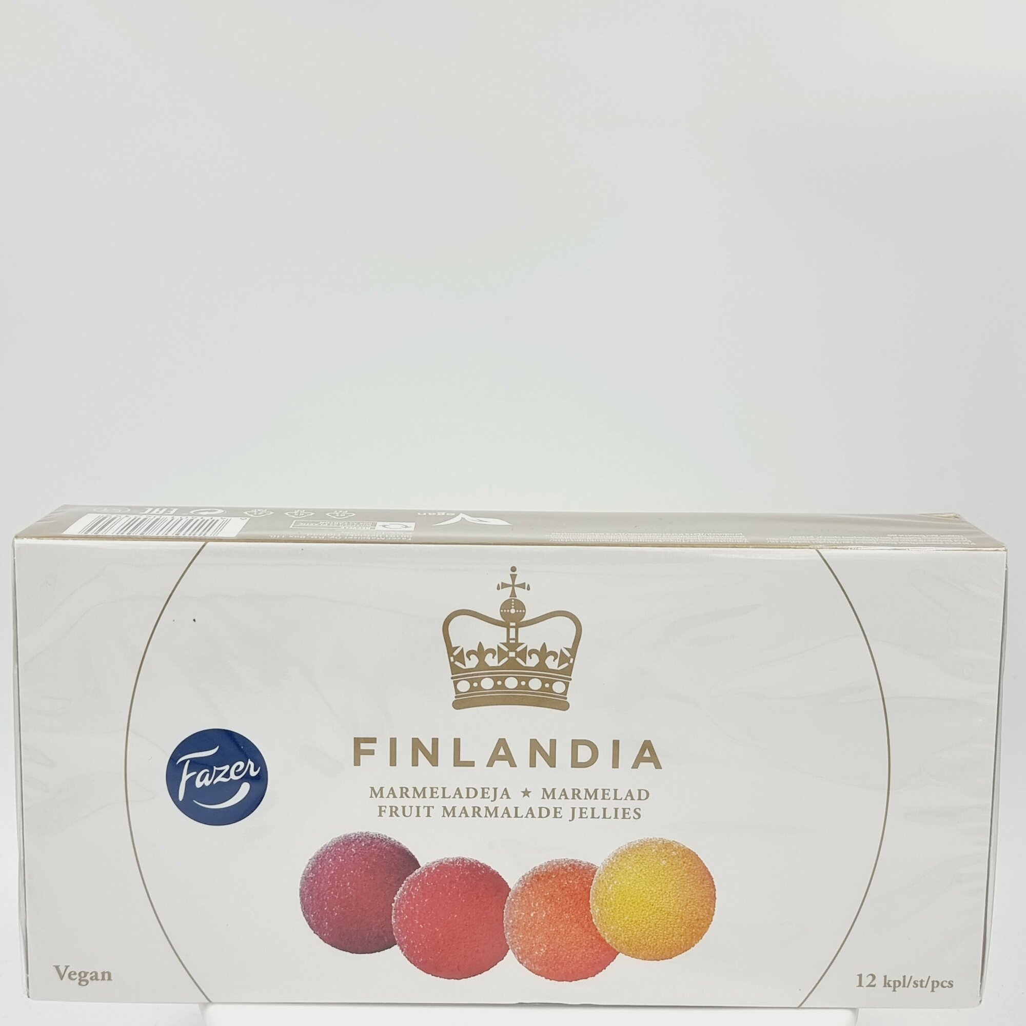 Мармелад Finlandia от Fazer изменит ваше представление о мармеладе! Роскошный праздничный мармелад премиального качества — ассорти из 4 классических фруктовых вкусов, в форме искрящихся шариков, красиво сервированных в элегантной коробке. Нежный абрикос, сладкий лимон, черная смородина и клубника — лакомство от которого невозможно оторваться. Не содержит желатин, вегетарианский, постный продукт. Вес: 260 г. Состав: сахар, сироп глюкозный, вода, желирующий агент (Е 440), регуляторы кислотности (Е 330, E337), пищевые красители (концентрат батата, яблока и сафлора), ароматизаторы, красители (Е163, Е160а). Пищевая ценность: жиры — 79 г. Энергетическая ценность: 320 ккал. Срок годности: 8 месяцев. Хранить в сухом месте при температуре от +16 до +20 °C. Страна производства: Финляндия. Производитель: Fazer Confectionery Ltd, PL 110, Финляндия, 00101 Хельсинки.