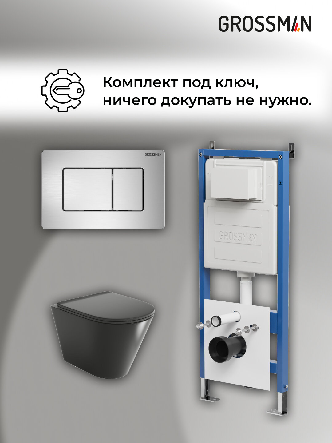 Комплект Унитаз подвесной с инсталляцией Grossman Classic 97.4477BMS.04.12M безободковый, черный матовый + Кнопка смыва хром сатиновый