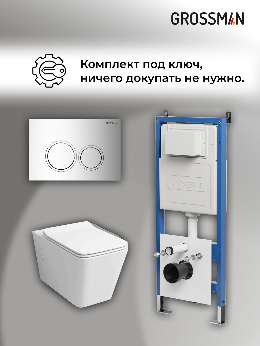 Комплект Унитаз подвесной с инсталляцией Grossman Galaxy 97.4414S.01.100 безободковый, белый + Кнопка смыва хром глянцевый
