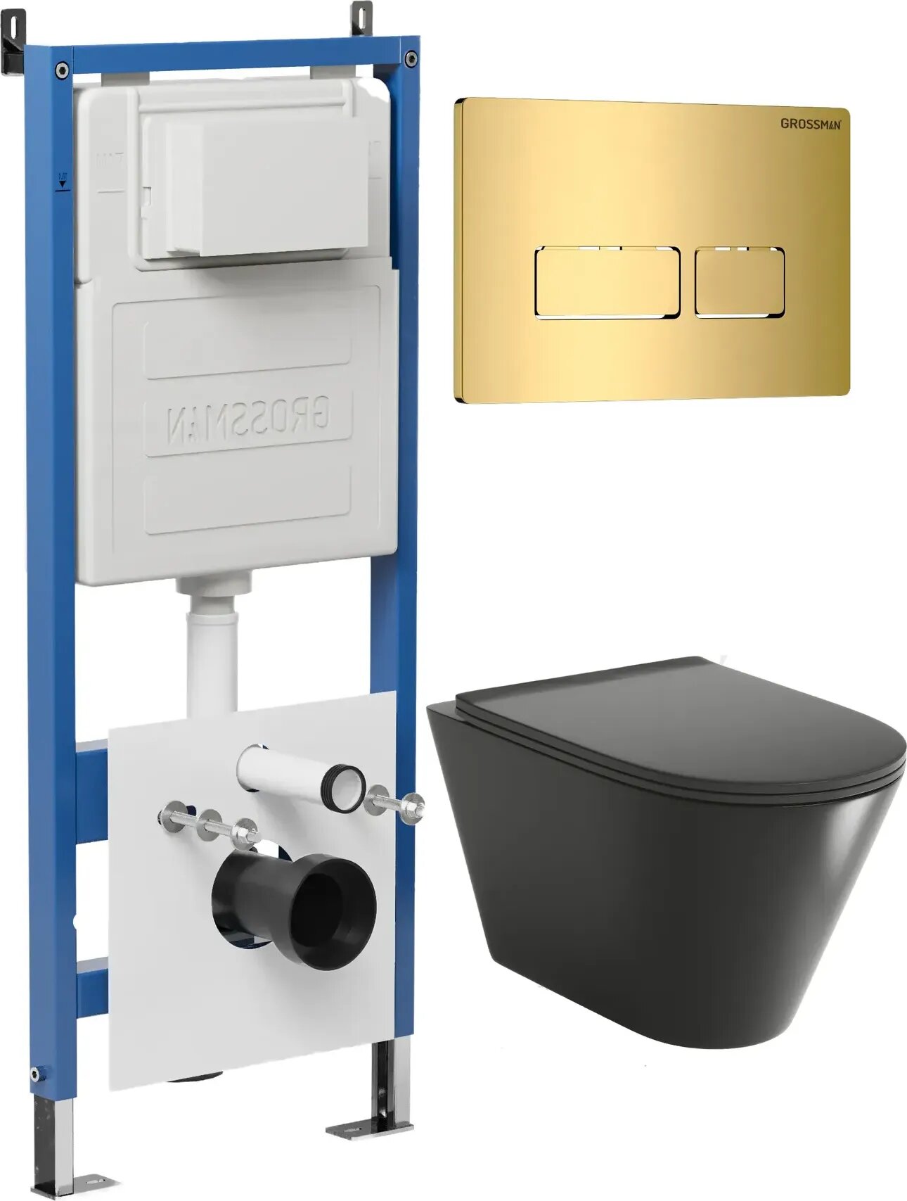 Комплект Унитаз подвесной с инсталляцией Grossman Pragma 97.4477BMS.03.300 безободковый, черный матовый + Кнопка смыва золото глянцевое