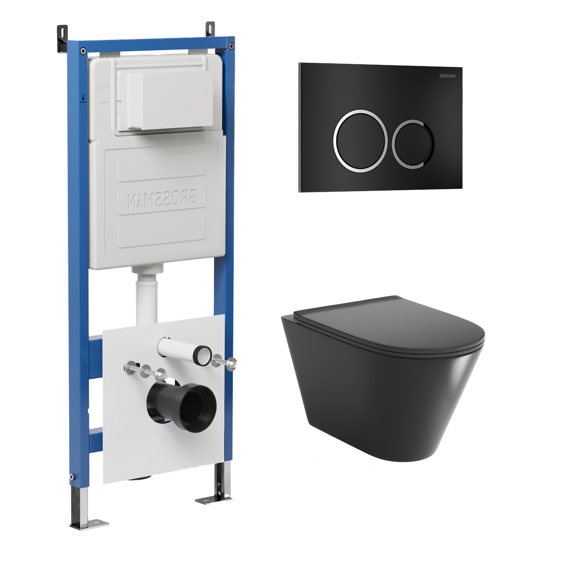 Комплект Унитаз подвесной с инсталляцией Grossman Galaxy 97.4477BMSQ.01.210 безободковый, черный матовый + Кнопка смыва черная матовая