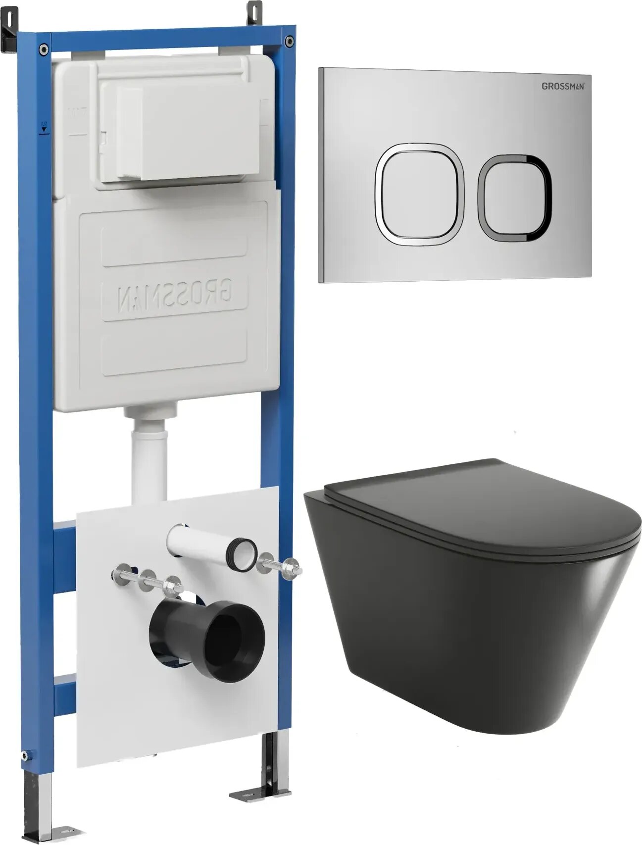 Комплект Унитаз подвесной с инсталляцией Grossman Cosmo 97.4477BMS.02.110 безободковый, черный матовый + Кнопка смыва хром матовый
