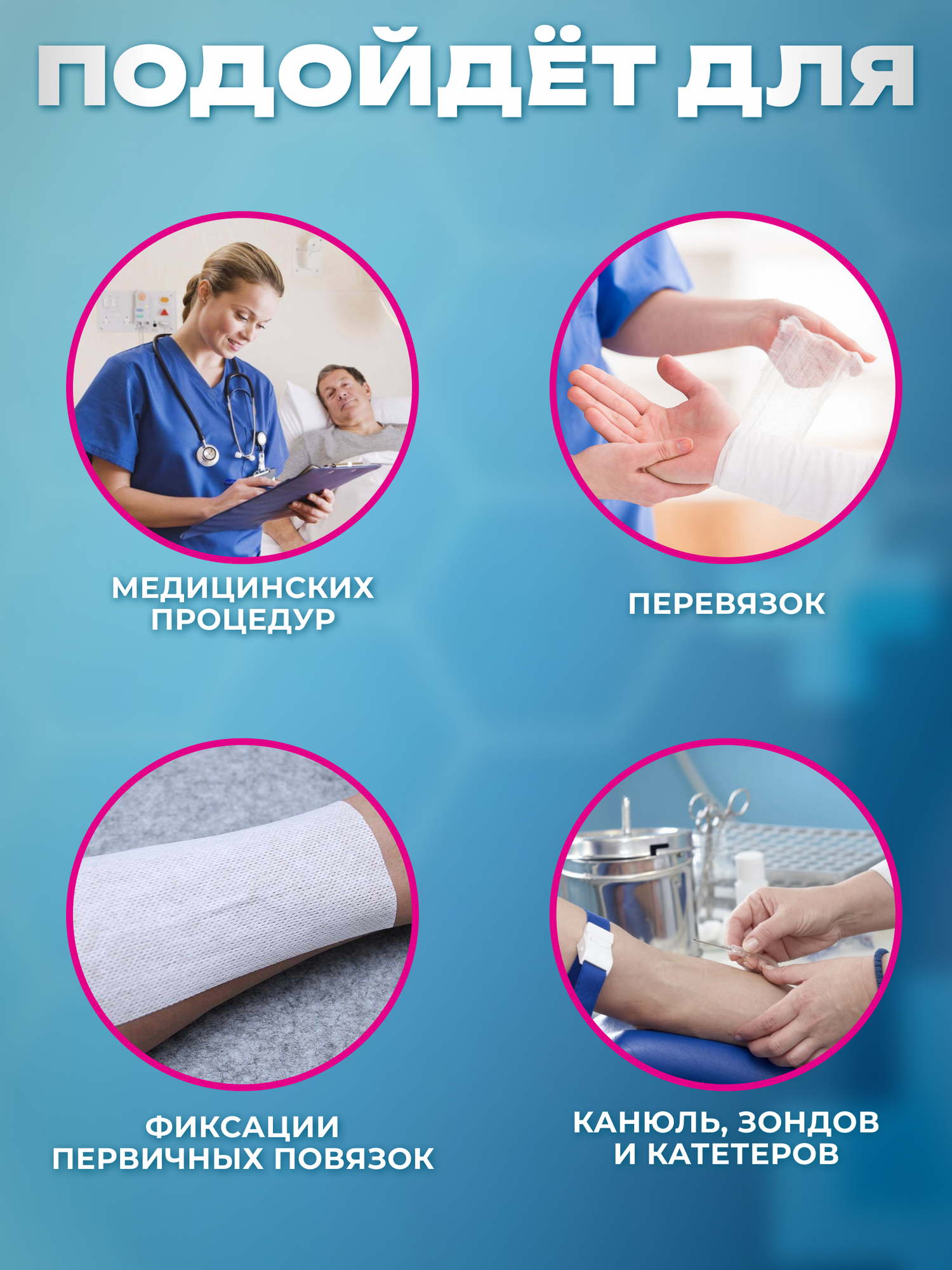 Некогезивные фиксирующие бинты являются одноразовыми медицинскими изделиями, используемыми медицинскими работниками, а также неспециалистами в клиниках и домашних условиях. Их можно использовать для фиксации первичных и вторичных повязок на длительный срок на неповрежденной коже. Медицинские изделия предназначены для использования в стерильных условиях.
