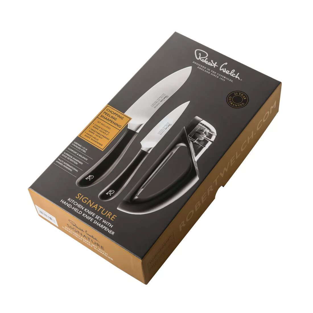 Набор из 2 кухонных ножей и точилки ROBERT WELCH SIGNATURE арт. SIGSA20SPEC1 В набор входит:SIGSA2095V — нож для чистки овощей 10 см;SIGSA2032V — нож поварской 14 см;SIGSA2102V — точилка для ножей. Компания Robert Welch, получив мировую известность как производитель столовых приборов из нержавеющей стали, предлагает вашему вниманию коллекцию кухонных аксессуаров серии Signature. Различные виды ножей для нарезки мяса, овощей, хлеба и других целей, отличаются особо прочным закалённым лезвием, способным длительное время оставаться острым без дополнительной заточки. Дизайн достойный Королевы Знаменитый бренд носит имя своего основателя — Роберта Уэлша. В 1955 году он, будучи выпускником британского Королевского колледжа искусств, попытался найти нечто среднее между вековыми традициями своей страны и беспрецедентными инновациями на основе столовых приборов. Роскошные столовые приборы претендовали на принадлежность к премиум-классу, но материал их исполнения — нержавеющая сталь — в то время считался неподходящим для изысканной сервировки. В этом еще одна заслуга Уэлша, которому удалось сделать свою продукцию желанной для самых престижных клубов, ресторанов, отелей и даже для королевского двора, отодвинув на второй план устаревшее столовое серебро. Подарочная упаковка Наборы поставляются в элегантных подарочных коробках. Ножи Robert Welch будут не только каждый день радовать Вас на кухне, но и могут стать отличным подарком для современной хозяйки.