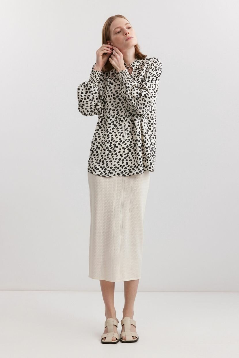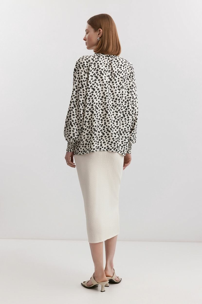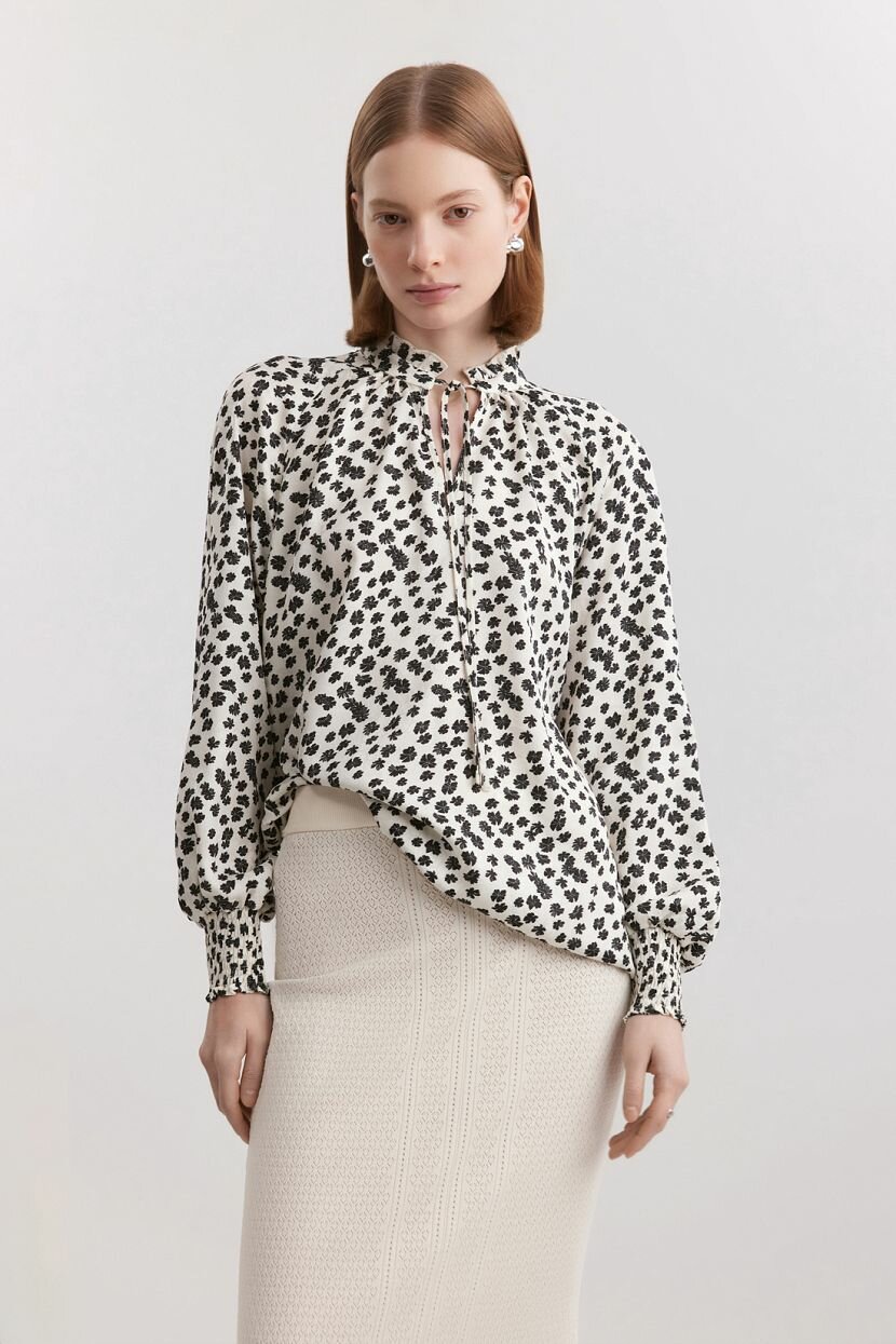Женская рубашка из 100% полиэстера отличается жаккардовой тканью с принтом. Свободный крой и длинные рукава реглан обеспечивают комфорт в носке, а эластичные манжеты и воротник стойка с бантом аккуратно завершают образ. Вырез по переду создаёт изысканный акцент, не нарушая целостности силуэта. Сорочка подойдет для повседневных casual и деловых офисных образов, вечерних и праздничных мероприятий. Благодаря свободному крою выгодно подчеркнёт достоинства фигуры любой комплекции, включая большие размеры и высокий рост. Материал с нежной блестящей текстурой легко сочетается с джинсами, юбками, лосинами или леггинсами, создавая стильные и нарядные образы для вечеринок, праздников, деловых встреч и романтических свиданий. Отличное решение для весны и лета благодаря легкости и воздухопроницаемости материала. Рекомендуется бережная стирка при температуре 30°C для сохранения цвета и текстуры изделия.