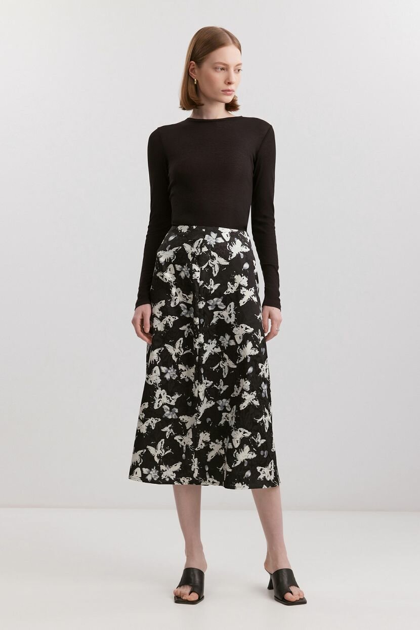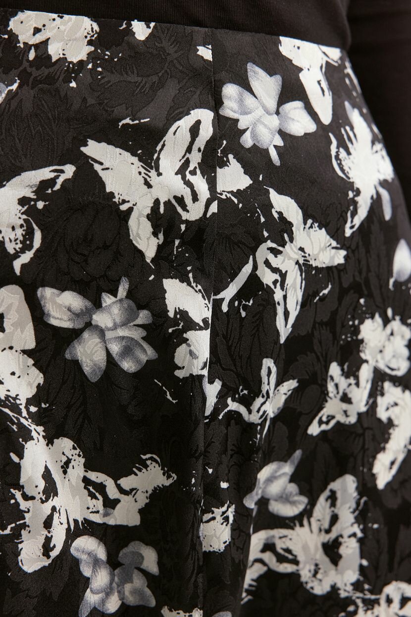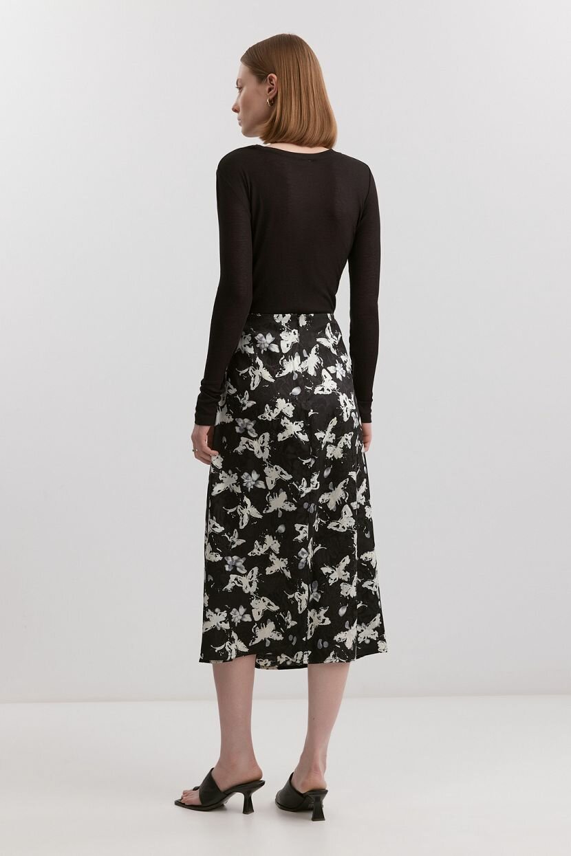 Женская юбка длины миди из жаккардовой ткани с принтом. Материал из 100% полиэстера формоустойчивый и лёгкий в уходе. Прямой крой, длина ниже колена, чёрный оттенок и аккуратный принт универсальны для разных случаев — от повседневных выходов до офисных или деловых встреч. Застёжка на потайную молнию в среднем шве спинки не нарушает лаконичность образа. Модель подойдёт для офисного гардероба благодаря классическому стильному дизайну. Легко трансформируется из повседневного образа в вечерний для праздничных и торжественных мероприятий. Легко сочетается с различными элементами женской одежды в актуальных модных аутфитах. Подходит для высокого роста, доступна в больших размерах. Рекомендуем бережную стирку при 30°C для сохранения первоначального вида и качество ткани.