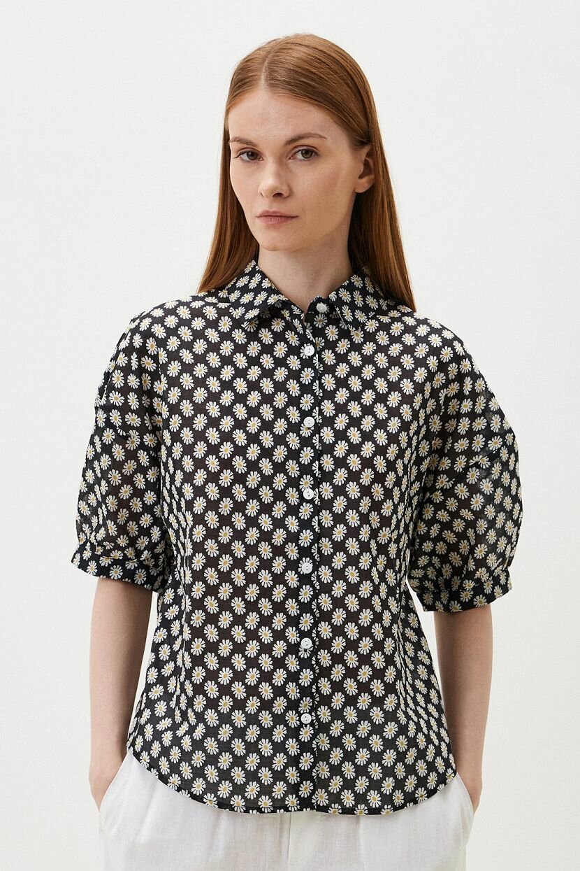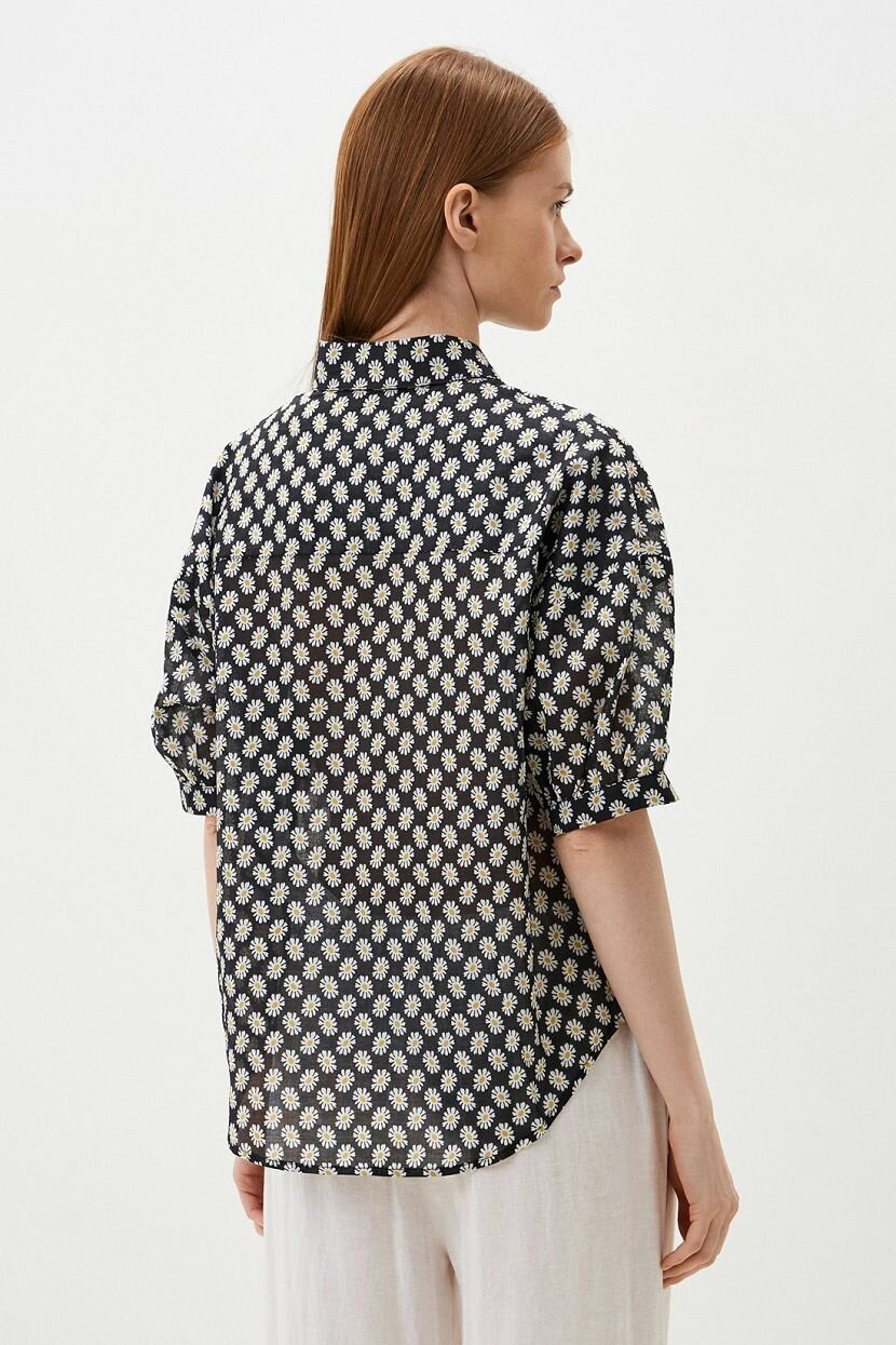 Женская блузка из 100% хлопковой вуали. Модель свободного кроя с отложным воротником и короткими рукавами создает ощущение легкости и свободы на протяжении всего дня. Декорирована принтом ромашки и фигурной линией низа, аккуратные пуговицы добавляют образу стильный акцент. Дополнит как офисные аутфиты с нестрогим дресс-кодом, так и повседневные образы. Легкость и дышащий натуральный материал делают блузку отличным выбором для летнего и весеннего гардероба. Доступна в больших размерах, подойдет для девушек высокого роста. Рекомендуем бережную стирку при температуре не более 30°C.