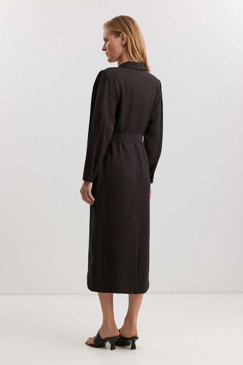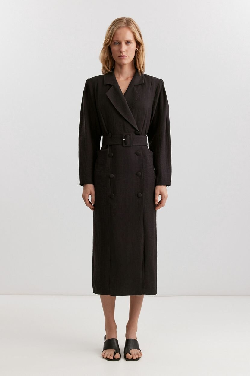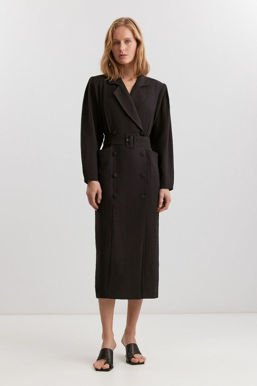 Женское платье длины миди в стиле блейзера из структурной смесовой (56% вискозы, 28% полиамида, 16% льна). Дышащий материал обеспечивает комфорт и свободу движений. Модель свободного кроя с классическим английским воротником и лацканами. Платье оснащено двубортной застежкой на обтяжные пуговицы и акцентной плечевой линией. Съемный пояс из основной ткани выгодно подчеркивает талию, а накладные карманы по переду добавляют функциональности. Длина ниже колена, отсутствие ярких деталей и однотонный материал спокойного оттенка делают платье идеальным выбором для повседневных и офисных аутфитов в кэжуал стиле. Доступно в больших размерах. Рекомендуется бережная стирка при температуре не более 30°C для сохранения качества ткани.