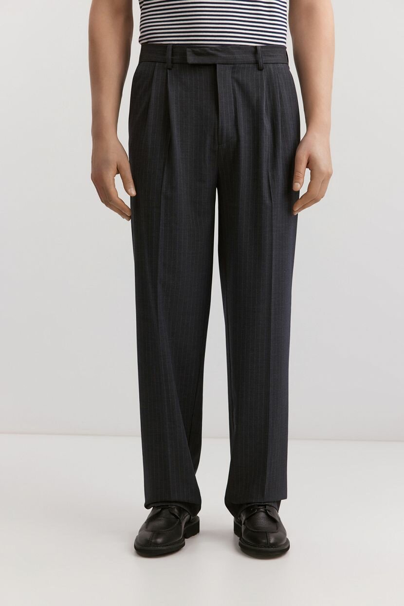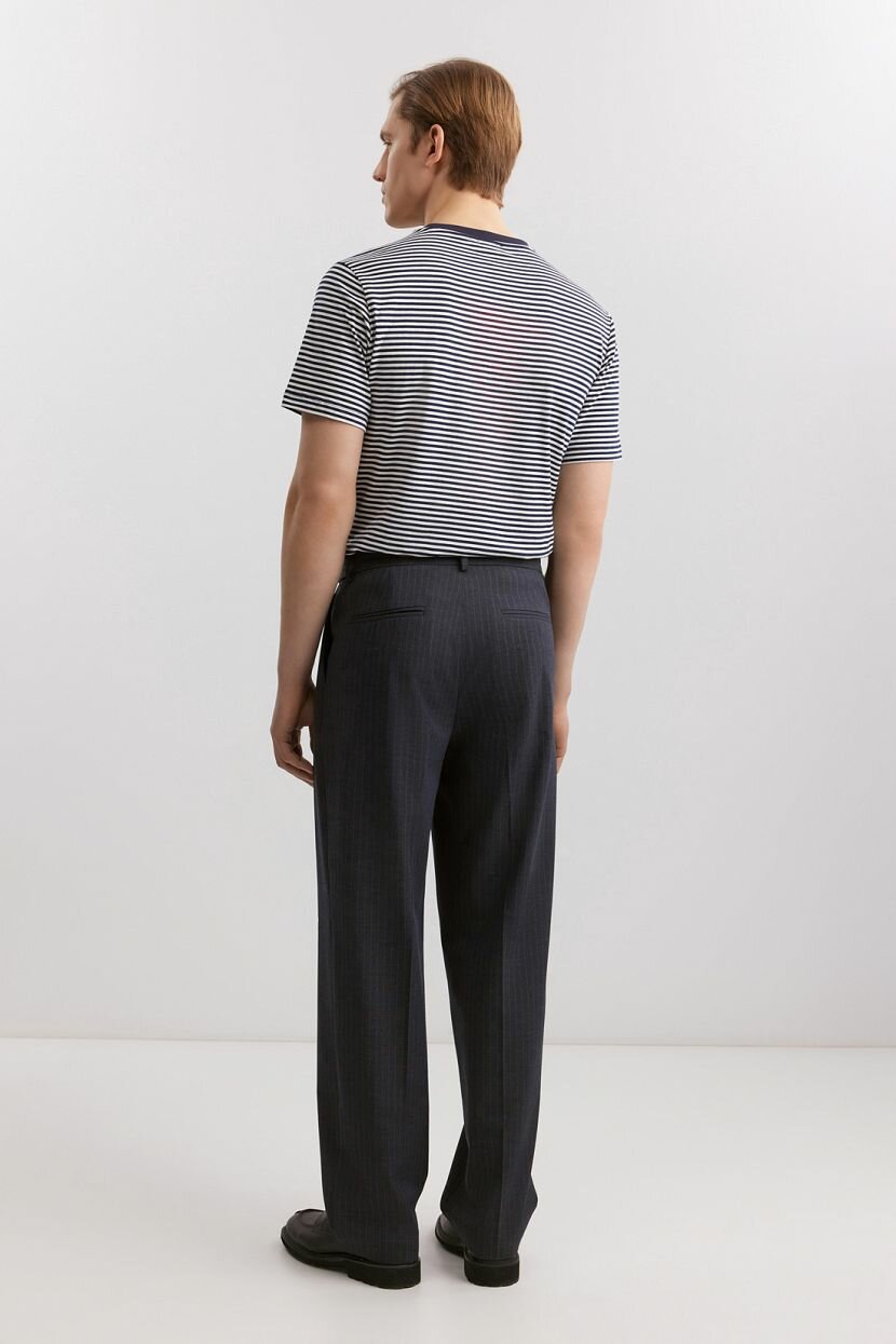 Мужские брюки из костюмной ткани с дизайном в полоску. Состав ткани: 65% полиэстера, 28% вискозы и 7% эластана, материал лёгкий и эластичный, а также формоустойчивый. Классические брюки свободной посадки подойдут для высоких мужчин, включая тех, кто носит большие размеры. Прямой крой, складки от пояса, наклонные карманы и базовый спокойный оттенок соответствуют требованиям офисного дресс-кода. Застёжка на молнию и потайной крючок добавляют удобства и практичности, не разрушая цельность силуэта. Брюки легко сочетаются с различными элементами мужского гардероба, делая их универсальным выбором для работы и прогулок. Брюки позволяют чувствовать себя уверенно и комфортно в аутфитах как повседневных, так и для работы. Рекомендуем бережную стирку при температуре не более 30°C для сохранения качества материала.