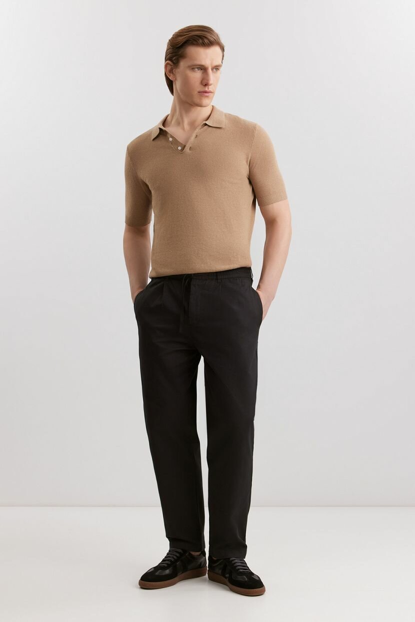 Мужские брюки чиносы из структурного 100% хлопка. Прямой крой создаёт стильный удобный образ на каждый день. Брюки оснащены эластичным поясом с дополнительной регулировкой шнуром, боковыми карманами в швах и прорезными карманами сзади. Благодаря натуральной дышащей ткани, они отлично подойдут для теплой погоды весенне-летнего сезона. Органично дополнят аутфиты как в офисном стиле, так и повседневные кэжуал. Подходят для мужчин высокого роста, доступны в больших размерах. Рекомендуется бережная стирка при температуре не более 30°C для сохранения качества ткани.